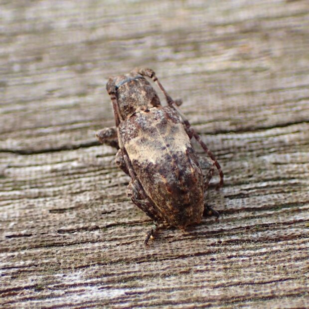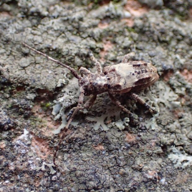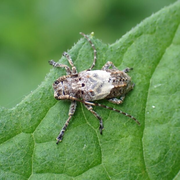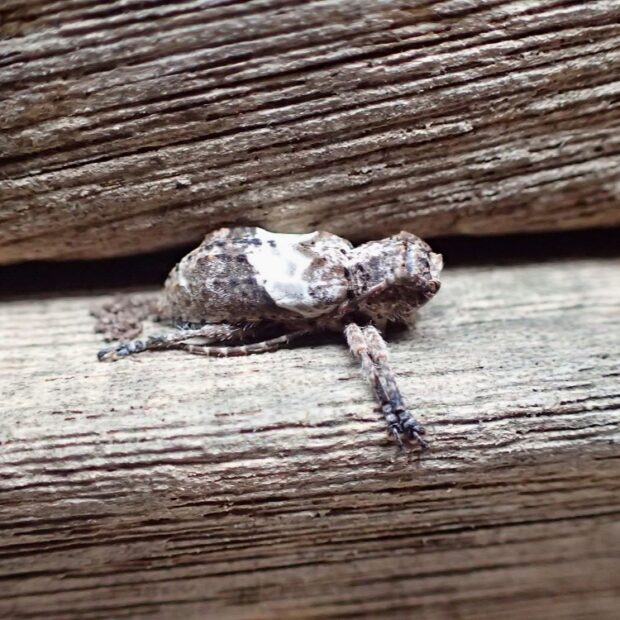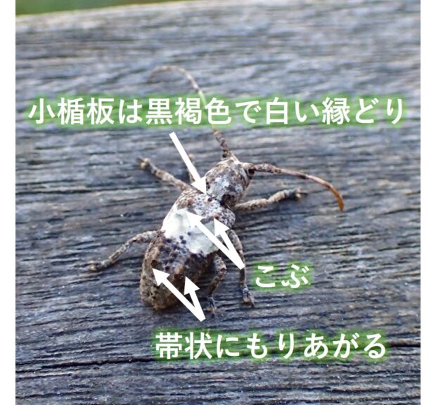 上翅(じょうし)に白い帯があるサビカミキリ。 平地~山地の雑木林などで普通に見られます。 ナカジロといいますが、 上翅の上の方が白くなっています。 いろいろな広葉樹の枯れ枝に集まり、 交尾・産卵します。