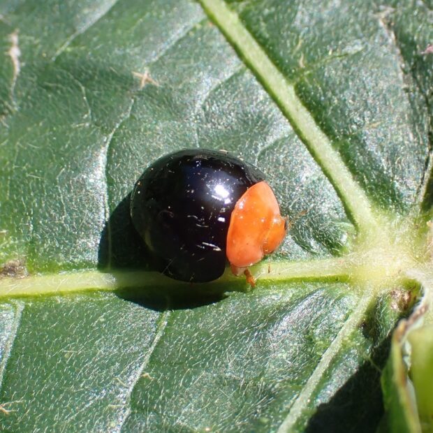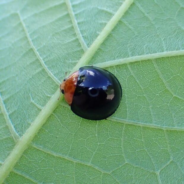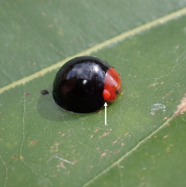 ツートンカラーの鮮やかなテントウムシ。 日本では2015年に記録された移入種で、 原産地は台湾、 中国南部、 東南アジアです。 カメムシの幼虫(主にマルカメムシの幼虫)を食べます。