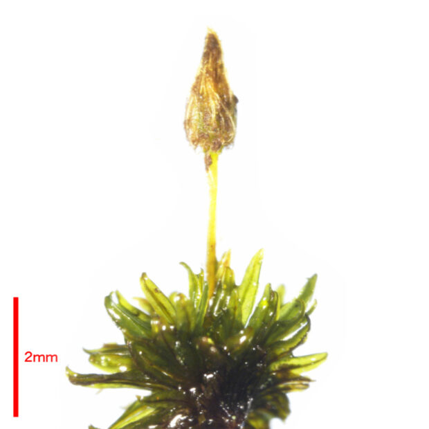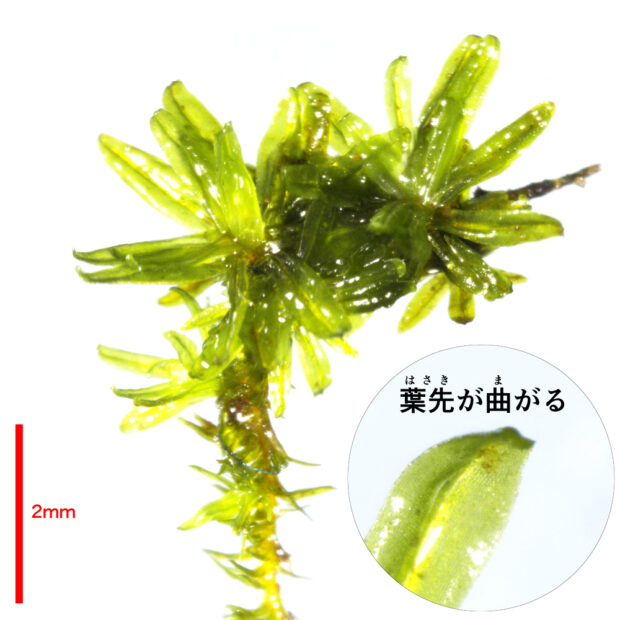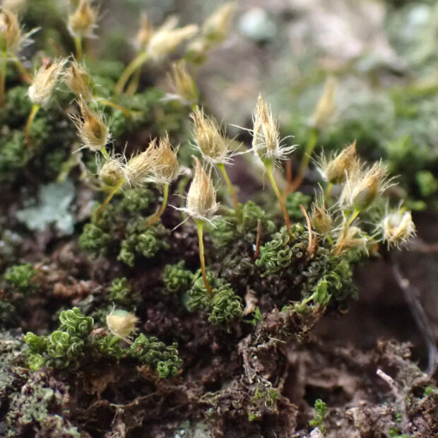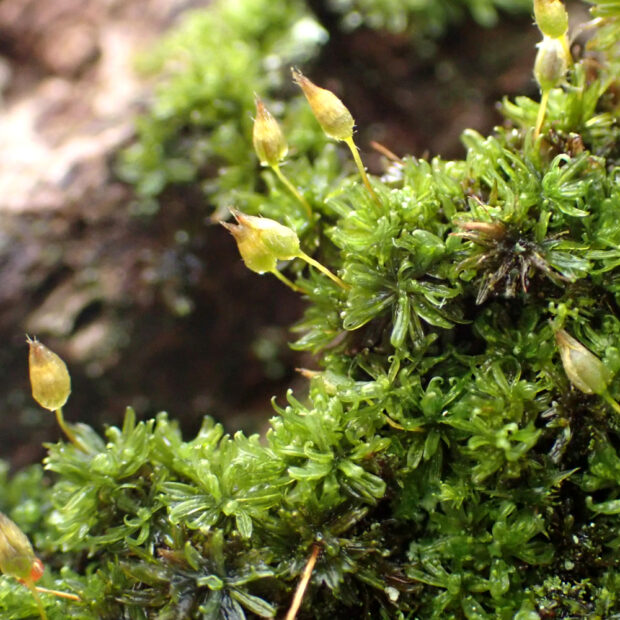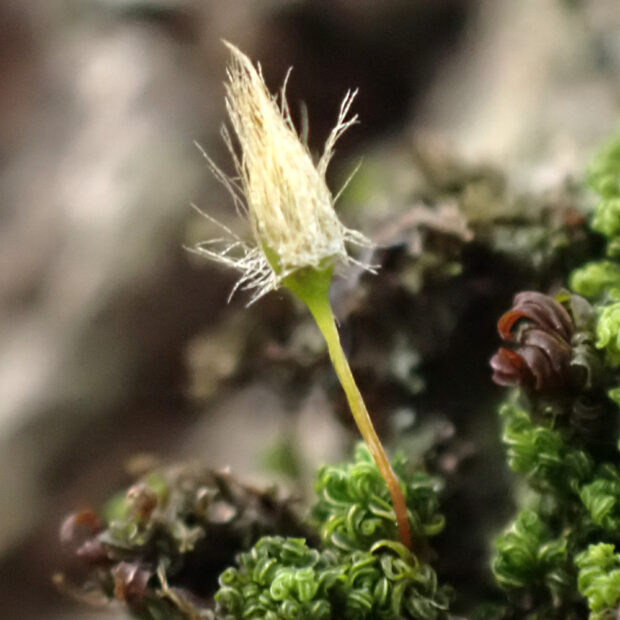 木の幹や岩場に生えるコケです。 蒴(さく)の帽(ぼう)に毛がたくさん生えている姿が独特で、 まるで蓑(みの)をかぶっているかのようです。