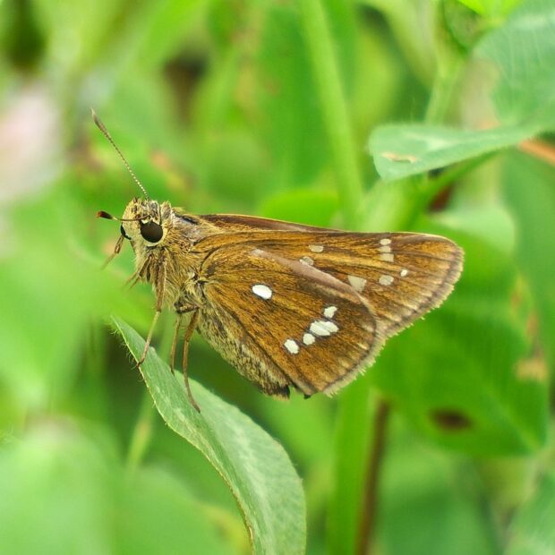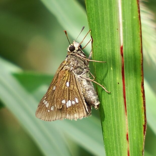 林縁の草地、 河川敷のススキ草原などで見られるセセリチョウ。 後ばね裏面にジグザグの白い紋、 中ほどにはっきりした白い紋があるのが特徴です。 草原が少なくなり、 全国的に減少しています。 蛹越冬。 (MT)