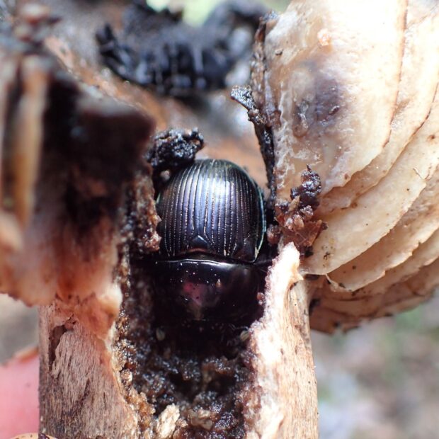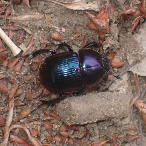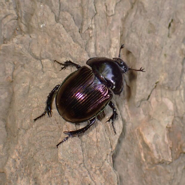 黒、 紫、 藍、 緑銅などの輝きをもつコガネムシ。 センチコガネの仲間は、 動物のフンなどに集まる糞虫(ふんちゅう)。 メスは地中にフンを運び込み卵を産み、 幼虫はフンを食べて育ちます。 生態系の分解者として大切な存在です。