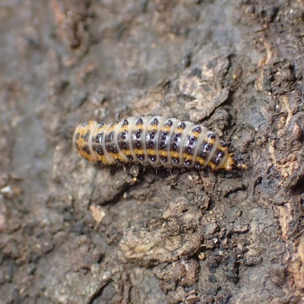 前ばねの上と下に朱色の模様があるオオキノコムシの仲間。 雑木林や公園で普通に見られ、 枯れ木につくカワラタケなどのキノコに集まります。 よく似た模様のものがおり、 識別には注意が必要です。