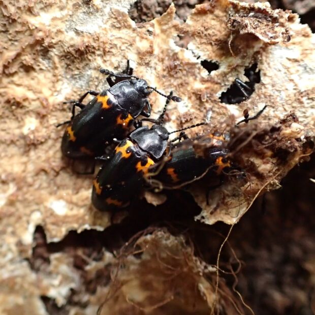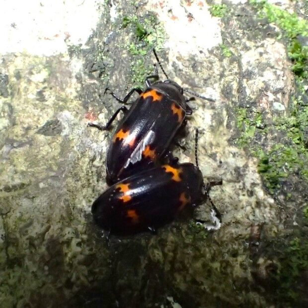 キノコを食べる黒にオレンジ模様の甲虫