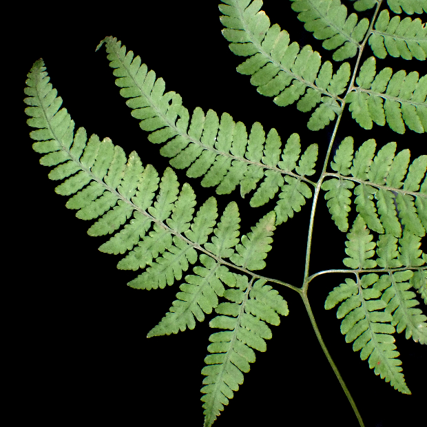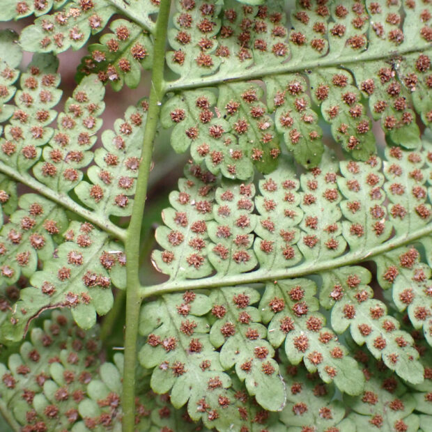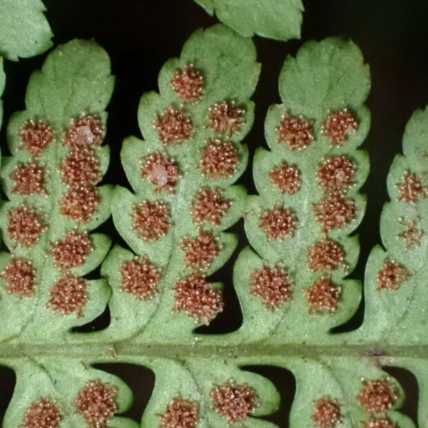 ●ミサキカグマは①最下羽片の柄が短めで、 ②最下羽片はカマ状に大きく曲がらず、 ③胞子のう群は葉のフチ寄りにつきます。