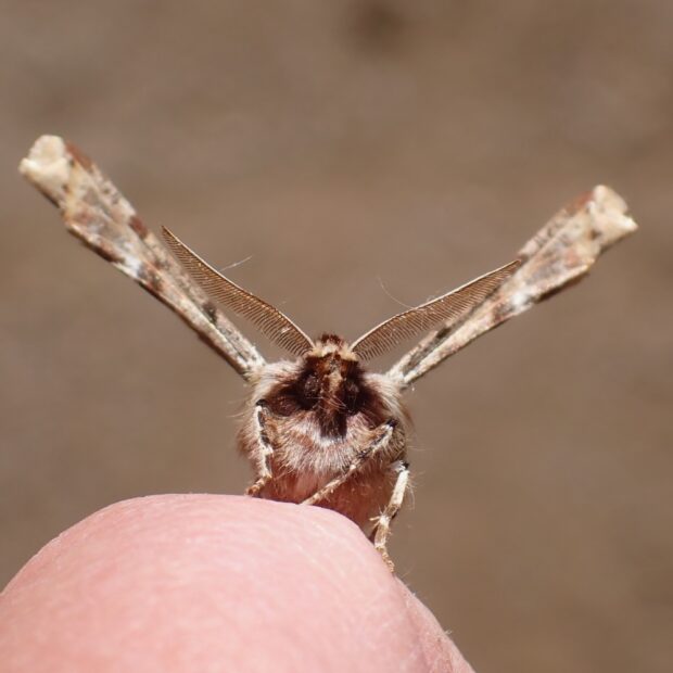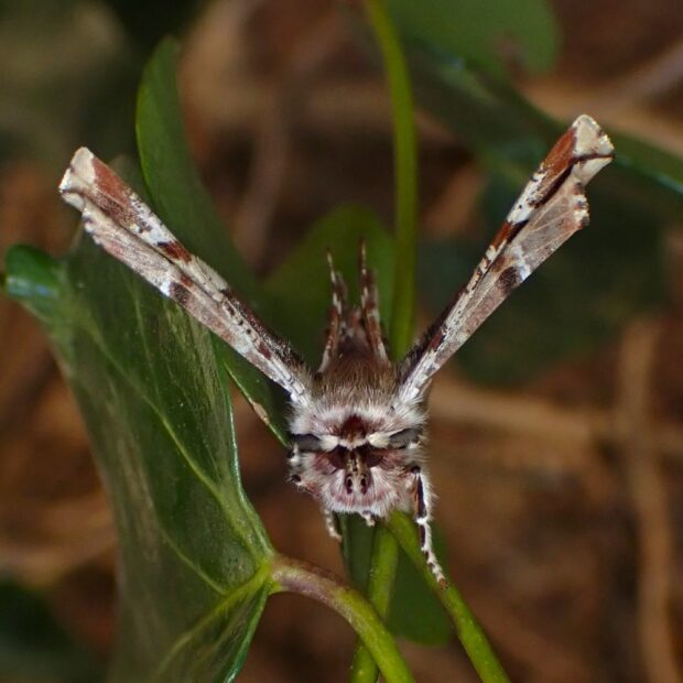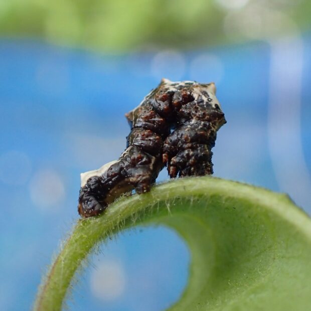 早春にあらわれるエダシャクの仲間。 成虫も幼虫も個性的な姿をしています。 成虫は、 はねを折りたたみ、 独特の姿勢でとまります。 幼虫は頭を腹側に折り曲げ、 鳥のフンのようなシャクトリムシです。 (MT)