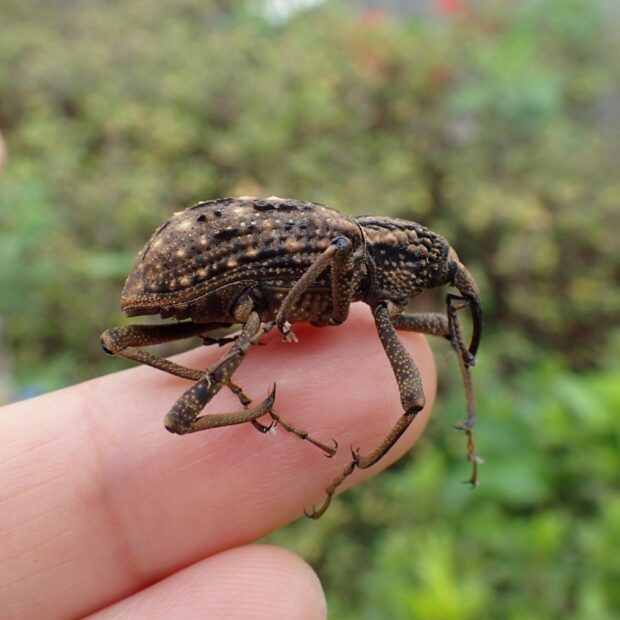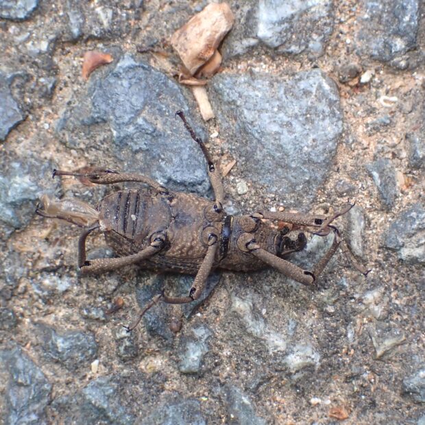 丘陵~山で見られる大型のゾウムシ。 外来種のヤシオオオサゾウムシを除けば、 日本で最大のゾウムシですが、 大きさは個体によって差があります。 危険がせまると、 下に落ちて死んだふりをします。