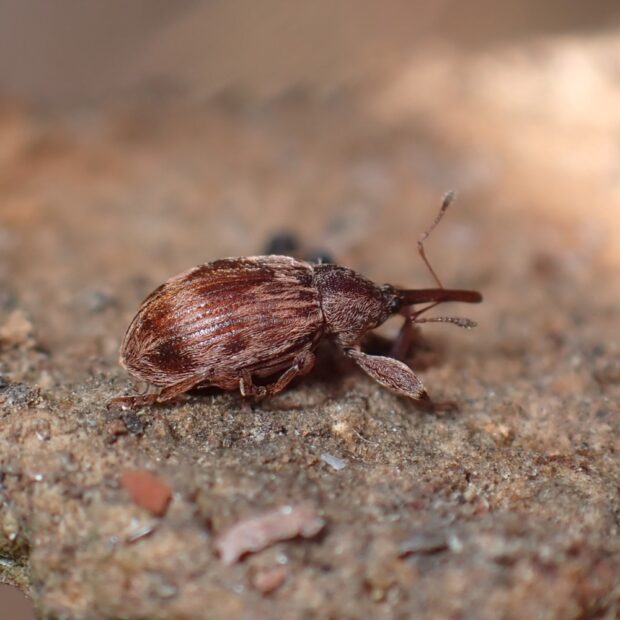 ハナゾウムシの仲間。 体は毛深く明るい茶色。 上翅(じょうし)の毛が生えていない部分は色が濃く、 ひし形に見えます。 メスはサクラの実に産卵し、 幼虫はサクランボを食べると言われています。