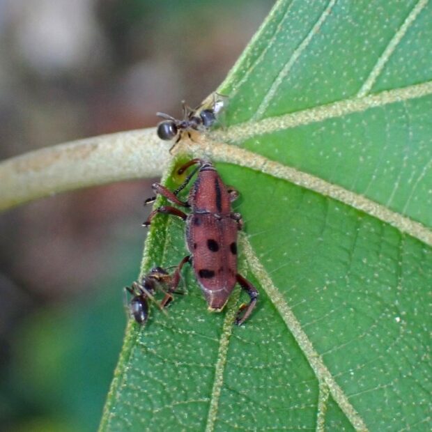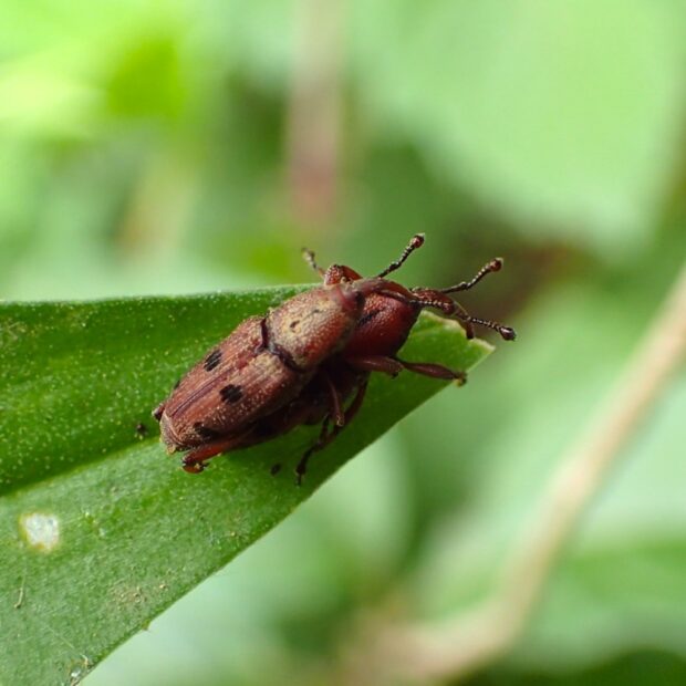 ツユクサにいるあずき色のゾウムシ