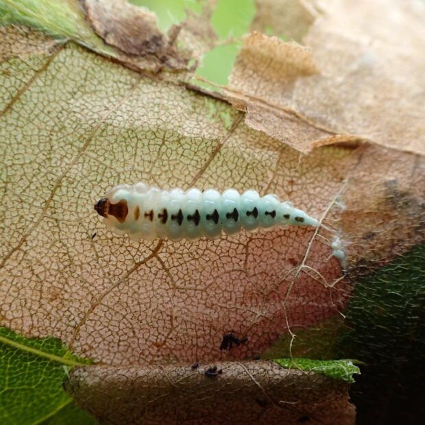 クズの葉で普通に見られるチビタマムシ。 幼虫がいると、 クズの葉の一部が白く透けたようになります。 成虫は、 葉の縁からジグザクに食べ進むことが多いです。 葉の食べあとを探すことがこの虫を見つけるコツです。