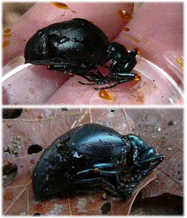 つかまえると、 あしの関節から、 黄色の強い毒(カンタリジン)が含まれる液を出しますので、 触らないでください。 黄色い液が皮膚につくと、 炎症をおこし水ぶくれになることがあります。 皮膚についた場合は、 よく水で洗い流してください。