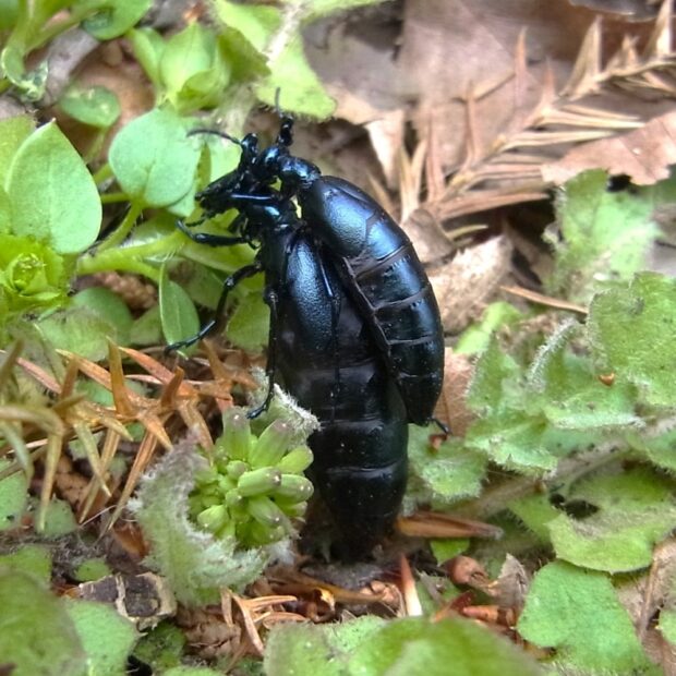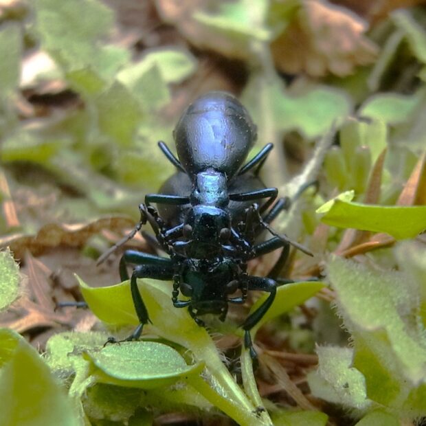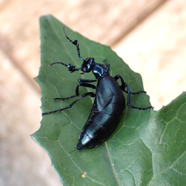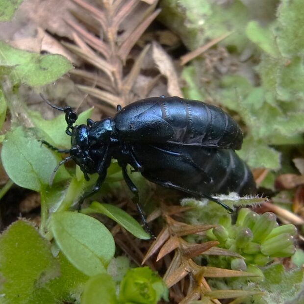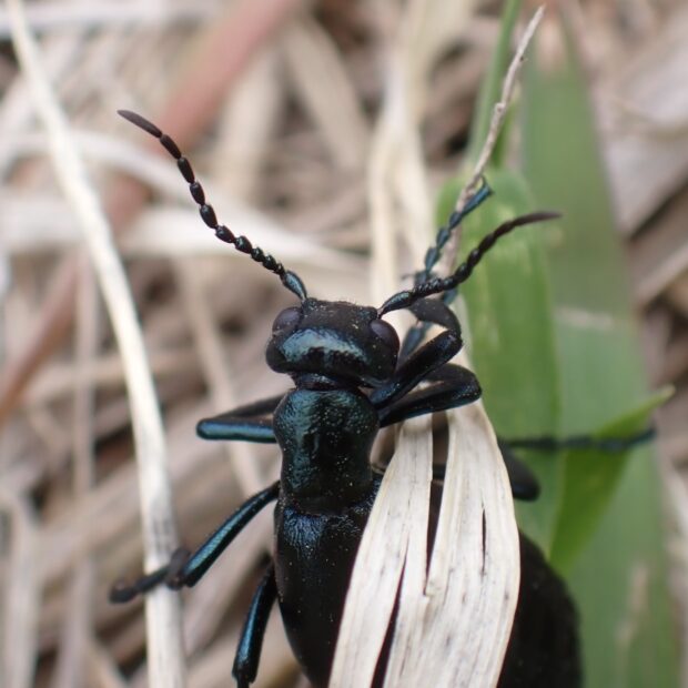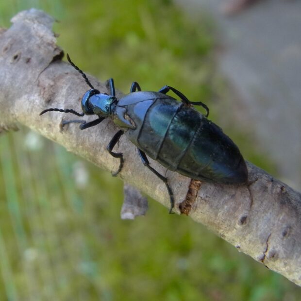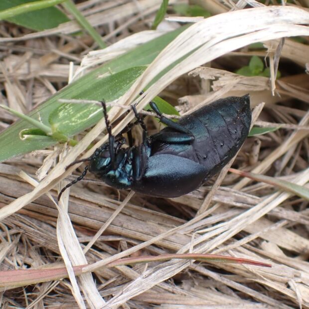 毒を持つツチハンミョウの仲間。 ハンミョウの仲間ではありません。 体は藍色、 後ばねは退化して飛ぶことはできず、 草地を歩き回ります。 メスは土の中に数千個もの卵を産みつけ、 ふ化した幼虫はハナバチの巣で育ちます。
