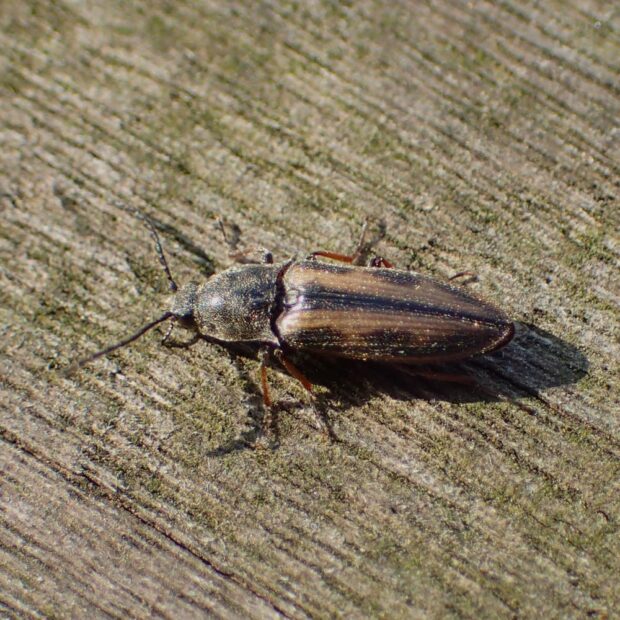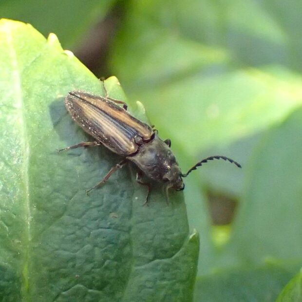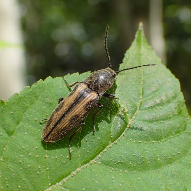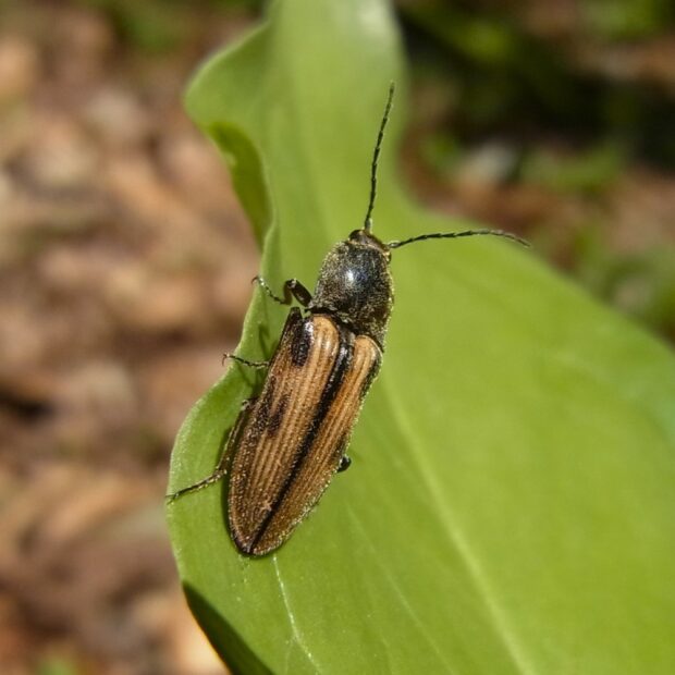 春にあらわれるコメツキムシ。 淡い茶色の前ばねに3対の楕円形の黒い紋がありますが、 紋には大きさや形に変化があります。 (MT)