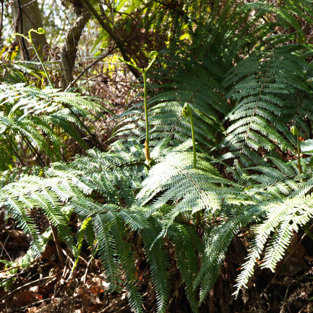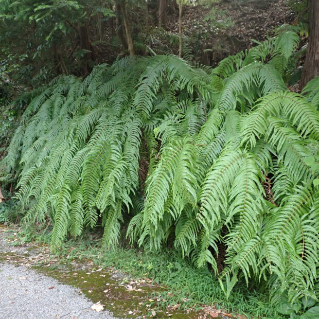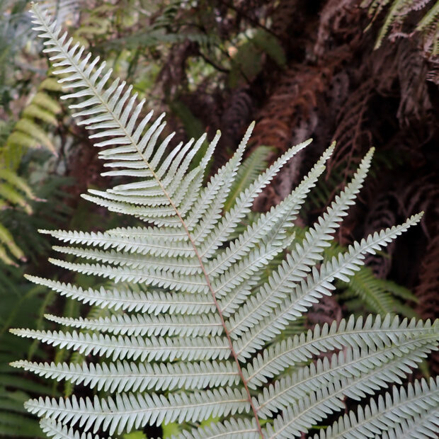 暖かい地域でごく普通に見られる大きなシダです。 しばしば道路沿いや林内を覆いつくすように群生します。 その名のとおり葉裏が白っぽいです。 逆Vの字形の葉はシダの中でも変わっています。