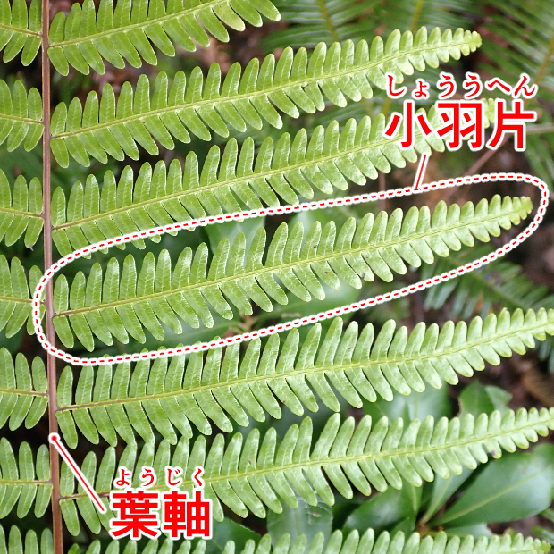●カネコシダはウラジロと同属でよく似ていますがより希少です。 ①九州以南に分布し、 ②葉裏はあまり白くなく、 ③小羽片は細くて葉軸と斜め(鋭角)につき、 ④小羽片の裂片先は尖ることなどが特徴です。