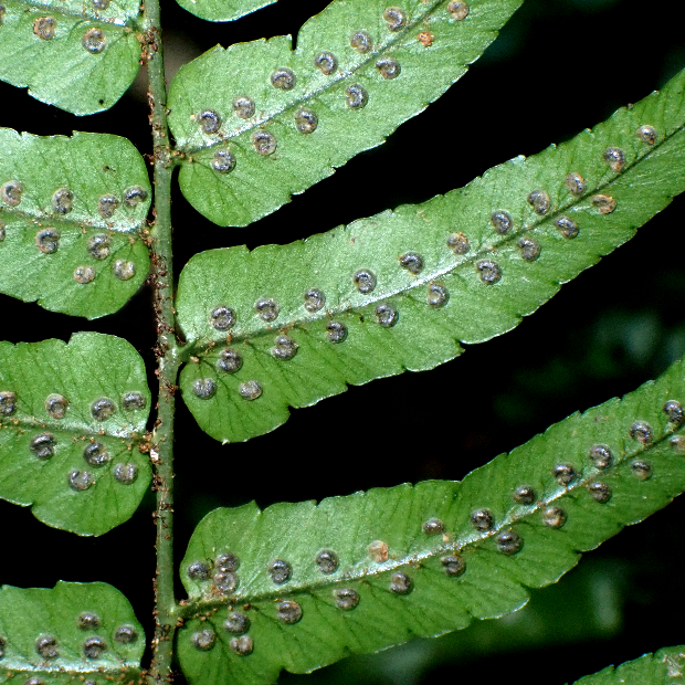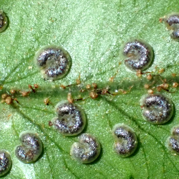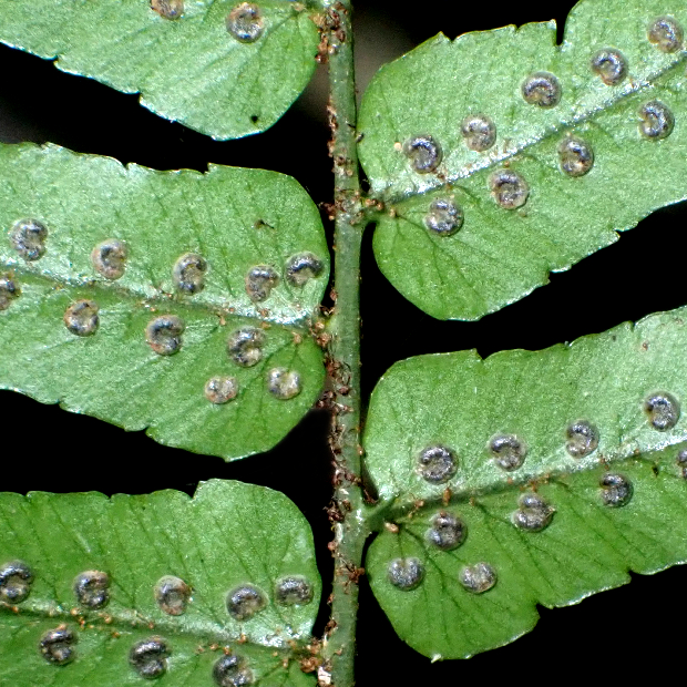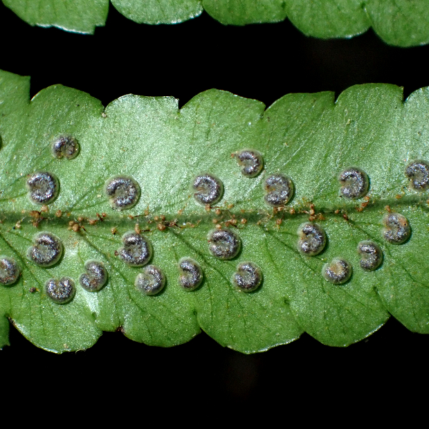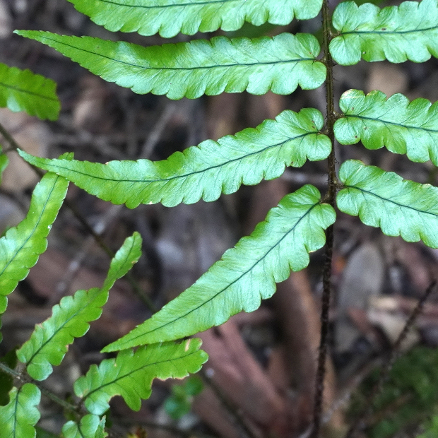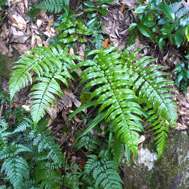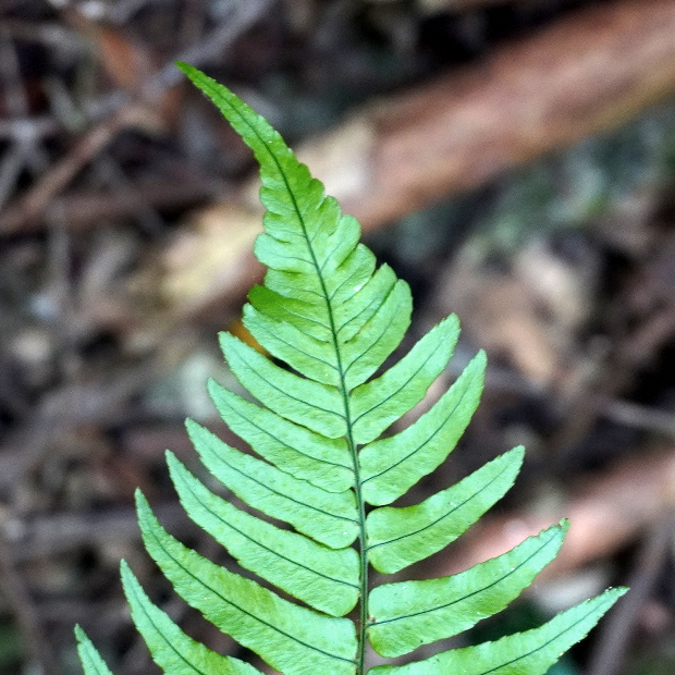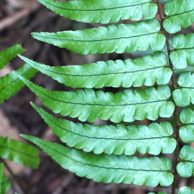 暖かい地域の林内に生えるシダ。 葉は厚みがあり、 パリパリとした質感があります。 羽片は浅く切れ込み、 裏につく胞子のう群は丸くて多数つき目立ちます。 名前はシダの宝庫である和歌山県の那智山と、 葉を広げる姿がクジャクの羽に似ていることに由来します。
