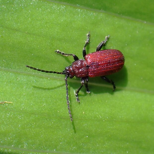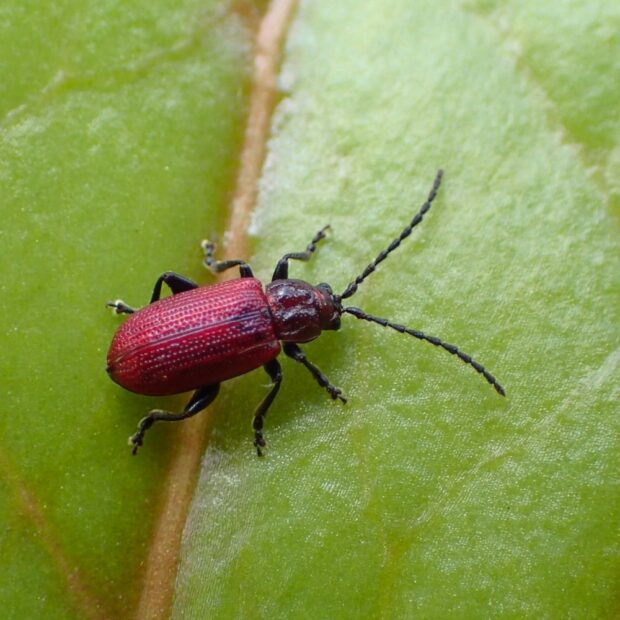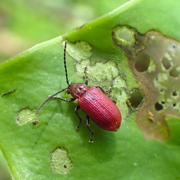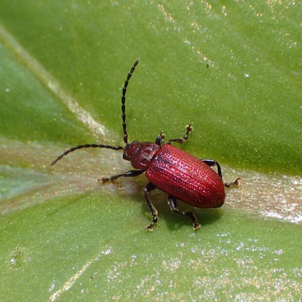 ユリ科植物を食べる紅色のノミハムシの仲間。 前胸はデコボコでシワシワに見えます。 ユリ科植物を食べるハムシは他にも数種類います。