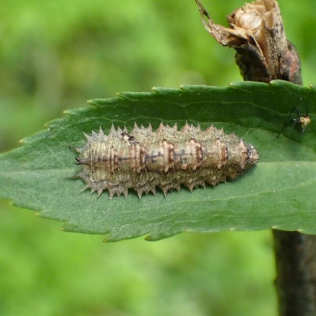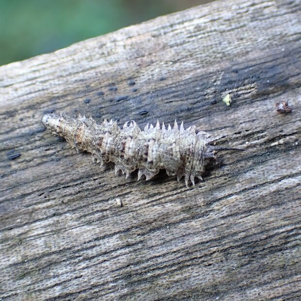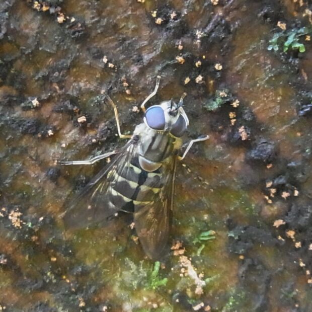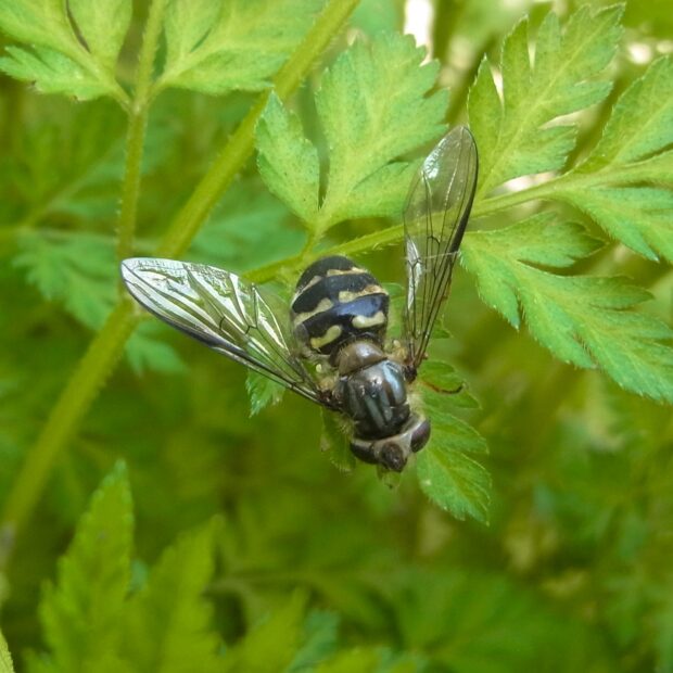 黄色の波形模様が特徴のヒラタアブ。 メスははっきりした波形になりますが、 オスは不明瞭です。 幼虫はへん平で、 襟巻のように枝に巻きつくことからエリマキアブと呼ばれます。 (MT)