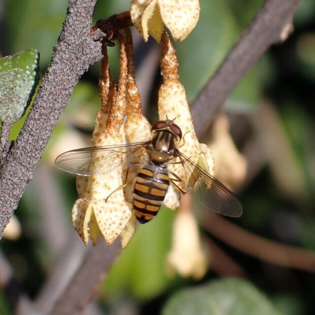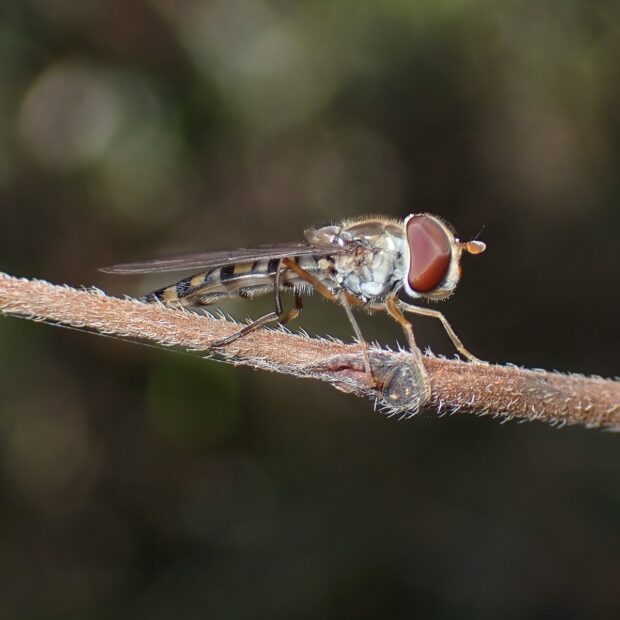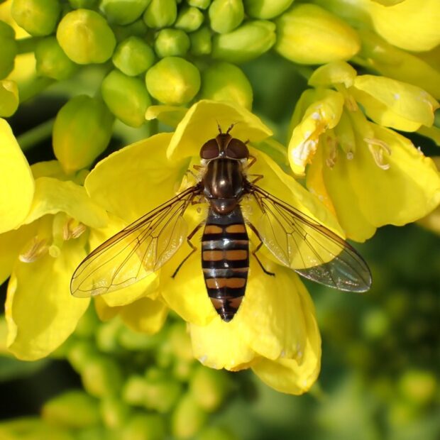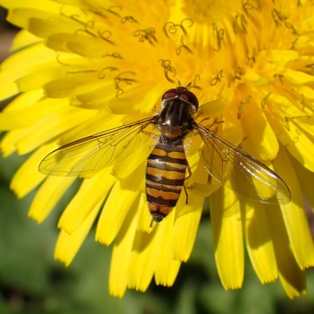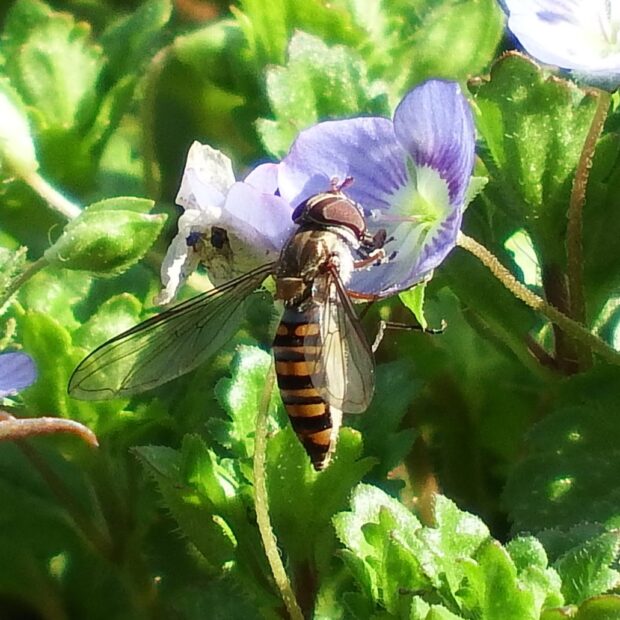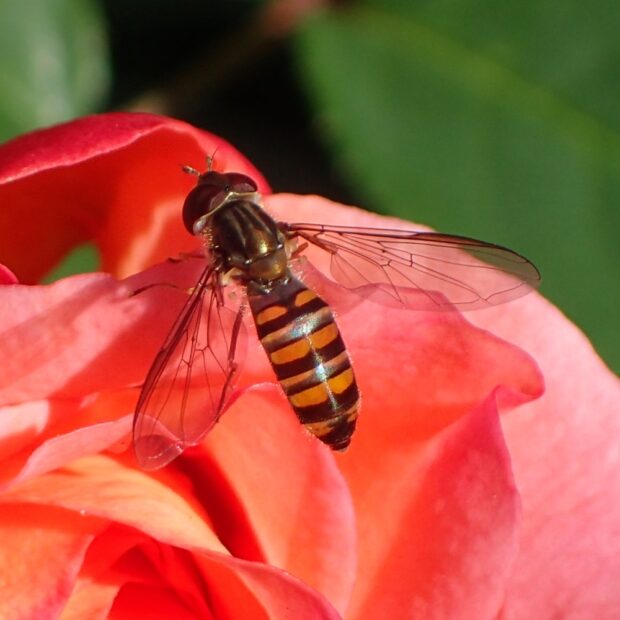 最も普通に見られるヒラタアブの仲間で、 家の庭でも見られます。 ほっそりした腹部には太い帯と細い帯の各2本ずつの帯があります。 花から花へホバリングをしながら飛び回ります。