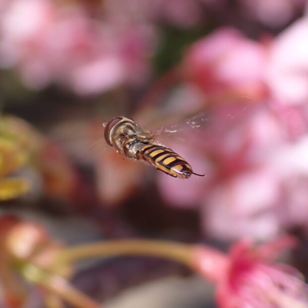最も普通に見られるヒラタアブの仲間。 公園や家の庭でも見られます。 ほっそりした腹部には太い帯と細い帯の各2本ずつの帯があります。 花から花へホバリングをしながら飛び回ります。