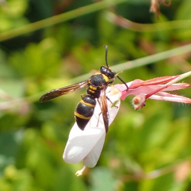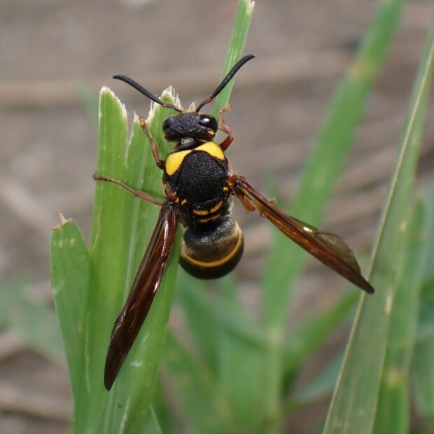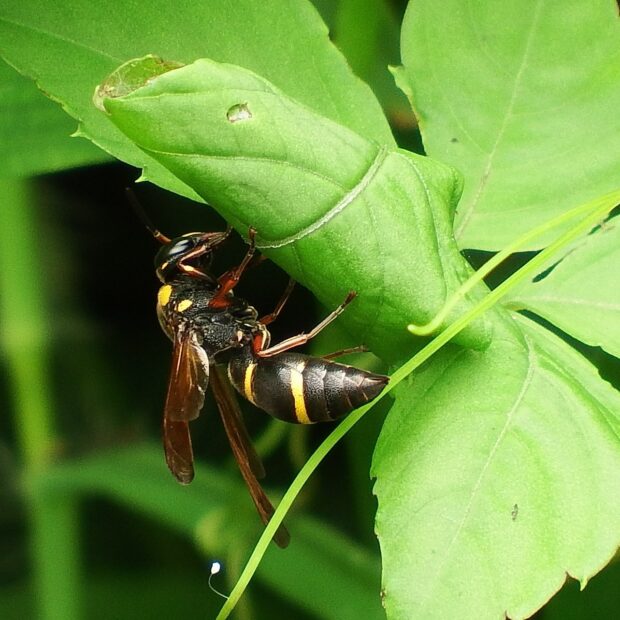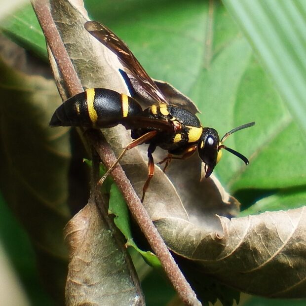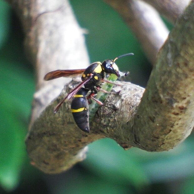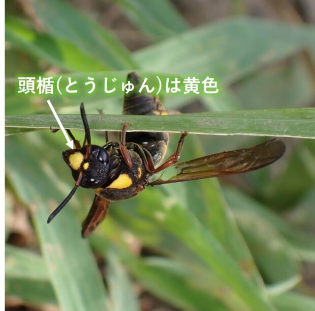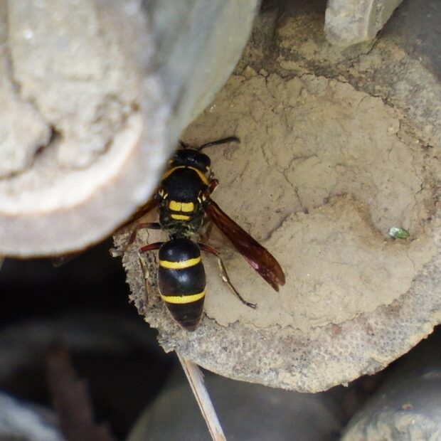 ドロバチの仲間。 竹筒、 樹木の穴などに泥の仕切りを作って、 巣を作り、 ガの幼虫(イモムシ)を運び入れて産卵します。 狩りバチは、 捕えた獲物に麻酔をかけ、 生きたまま幼虫のエサにします。