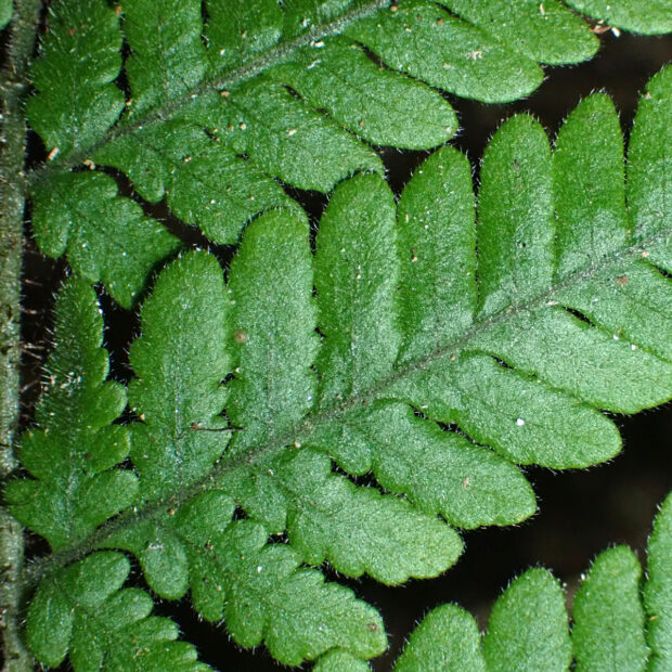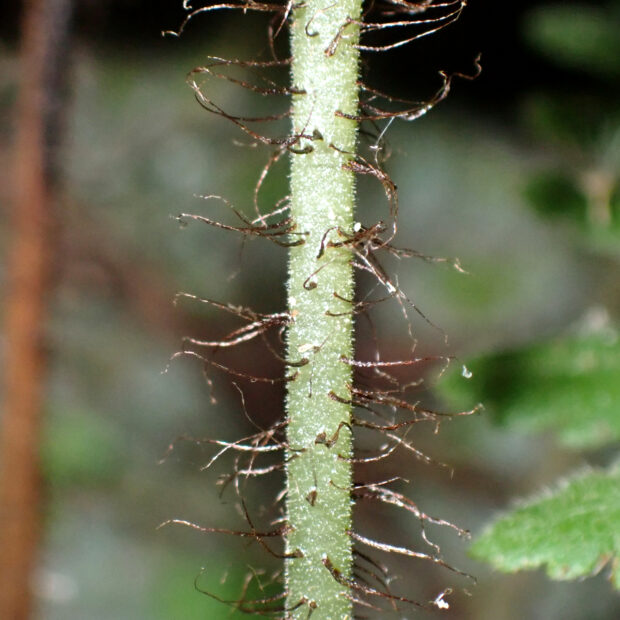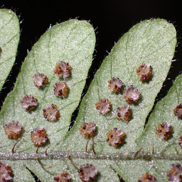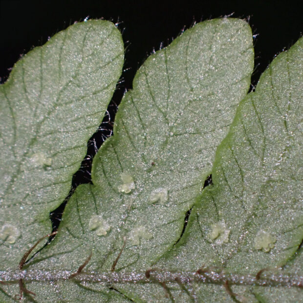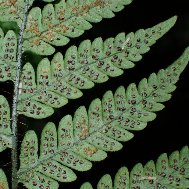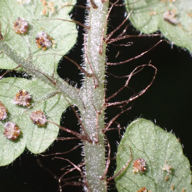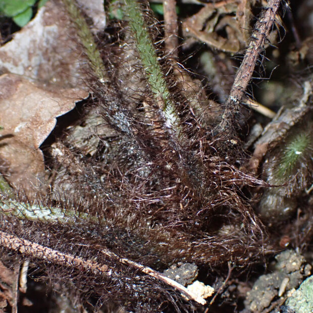 カツモウイノデの仲間のシダで、 大きく開いた茶色っぽい鱗片をたくさんつけます。 名前は洞穴のような薄暗いところによく生えることに由来し、 色合いも黒っぽい感じです。 一方で、 白っぽい岩である石灰岩地を好む傾向があります。