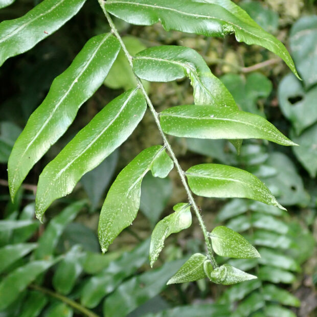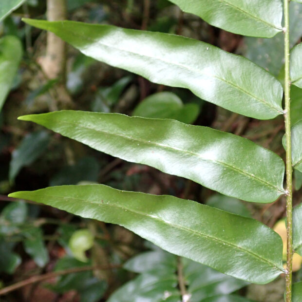 主に明るい斜面に群生する南方系のシダです。 人里近くでもよく大きくて長い葉をたらしていて、 その姿が伝説の鳥「鳳凰(ほうおう)」の尾に例えられました。 貫衆(かんじゆう)はヤブソテツの意味があります。 若葉は「宮古ぜんまい」といわれ、 宮古島などでは食用にもされます。