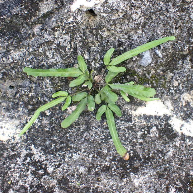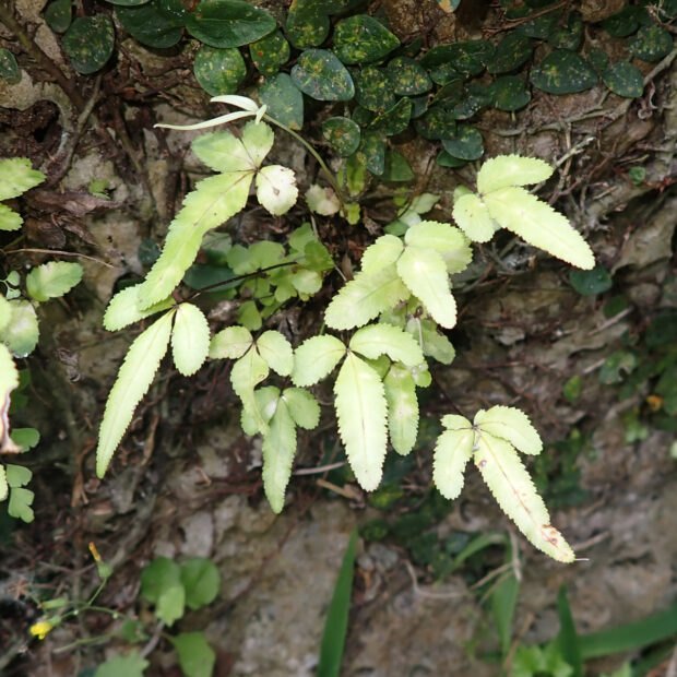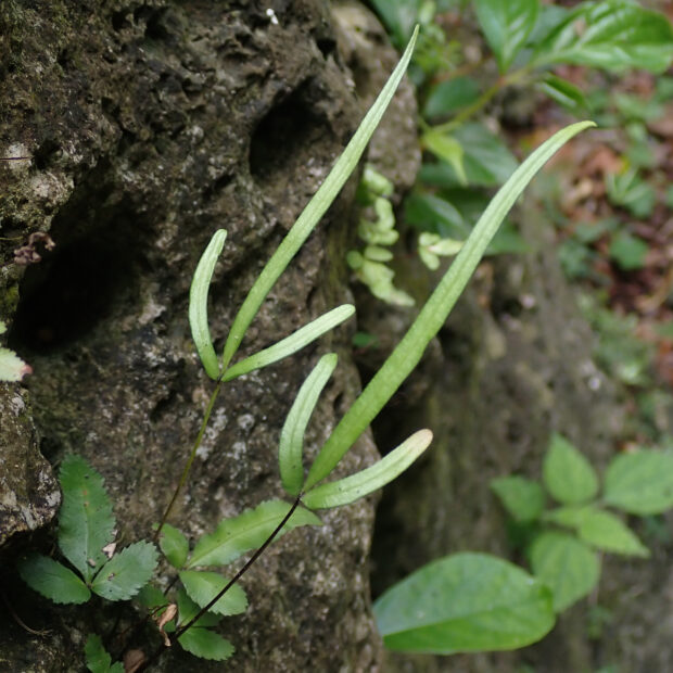 その名の通り琉球に多いイノモトソウの仲間のシダです。 住宅の石垣にも生えることから沖縄では最も身近なシダの1つです。 本土に多いイノモトソウよりも小さくて葉先は丸みが強いのでかわいらしさがあります。