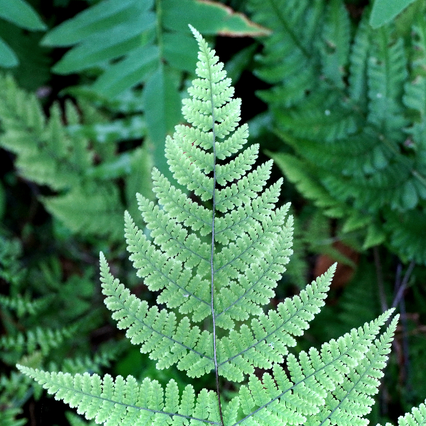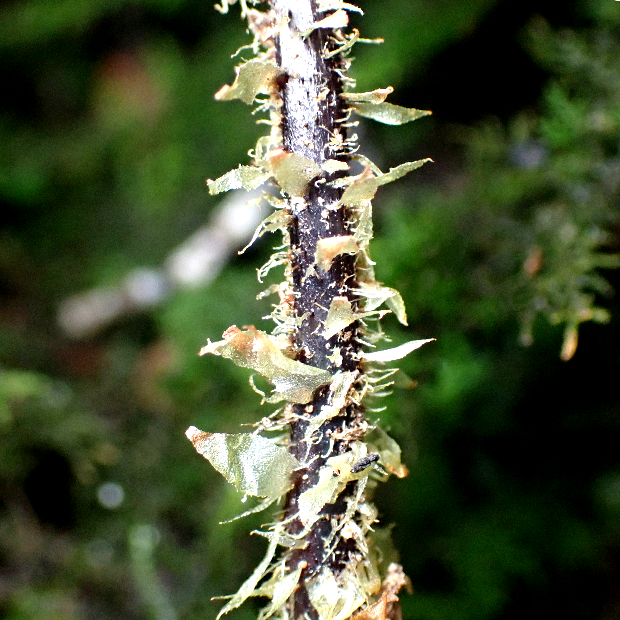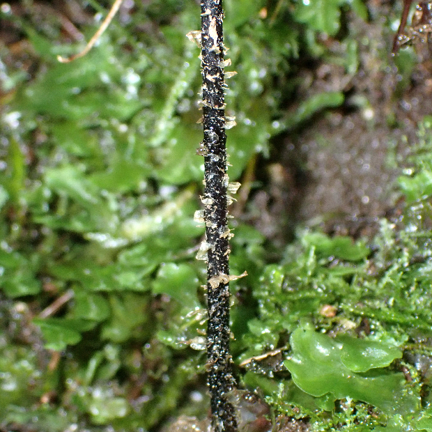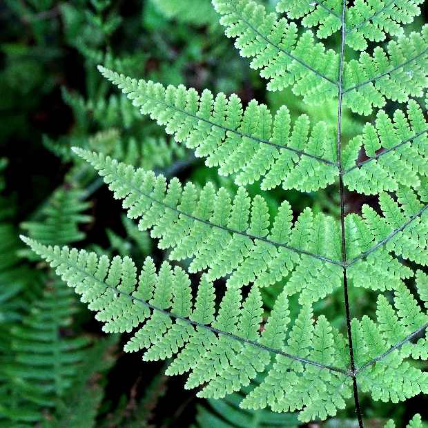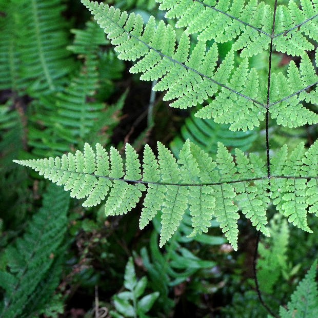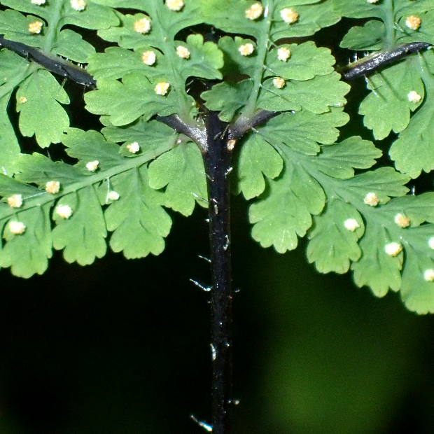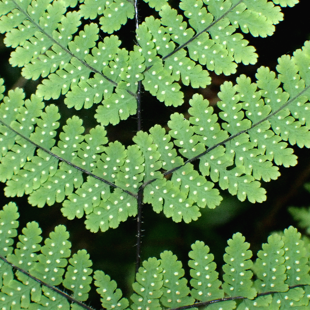 暖かい地域に生えるシダ。 葉質は薄くて細かく裂けるので、 やさしいな感じがします。 葉柄は黒くて、 白っぽい鱗片が多くつくのでその対比がきれいです。 ヒメシダ科のヒメワラビとは別のグループに属します。