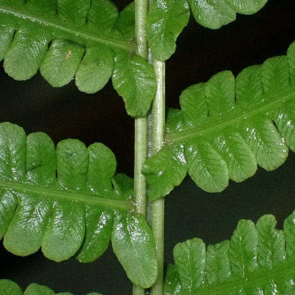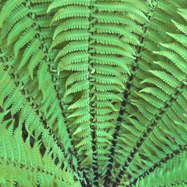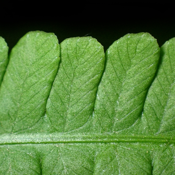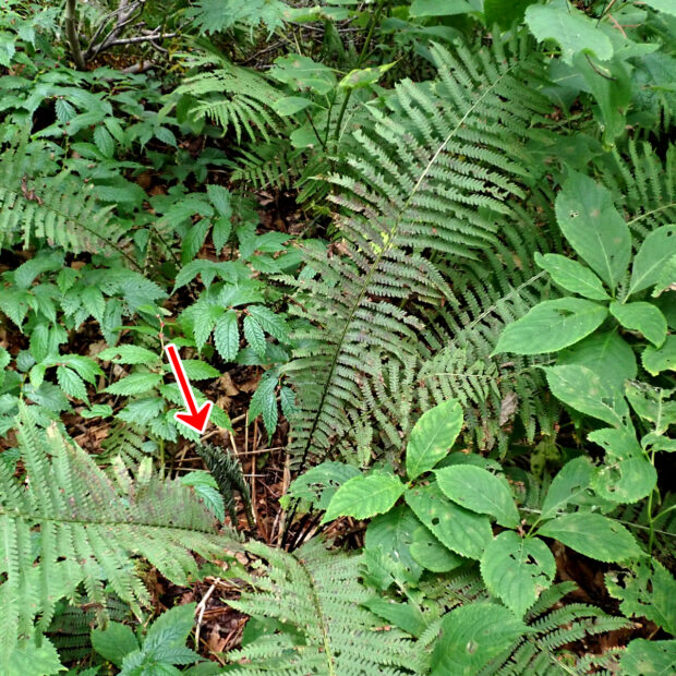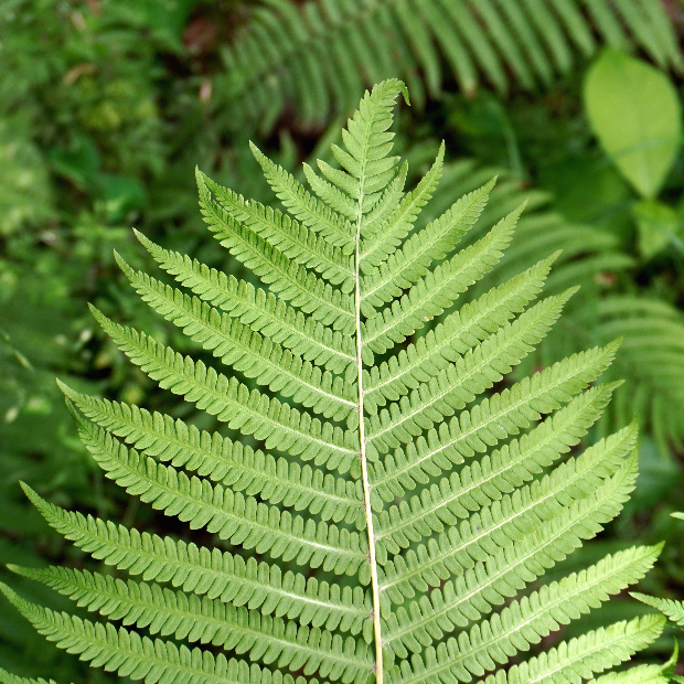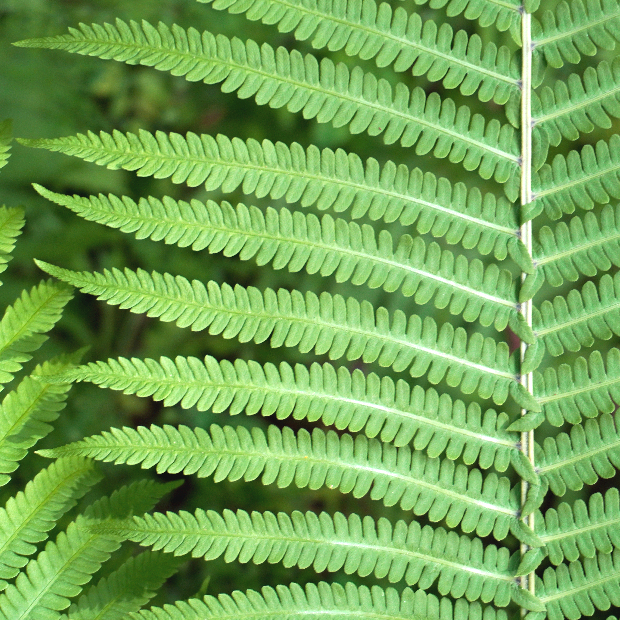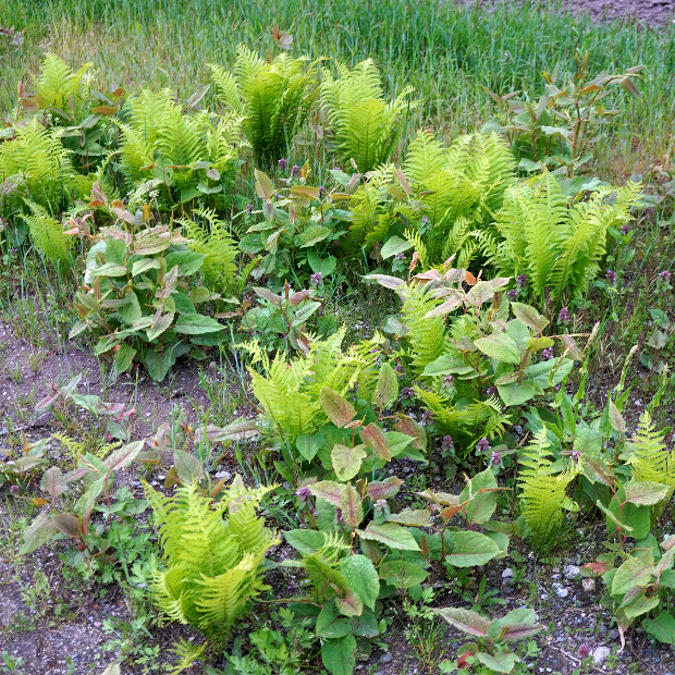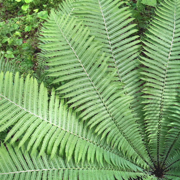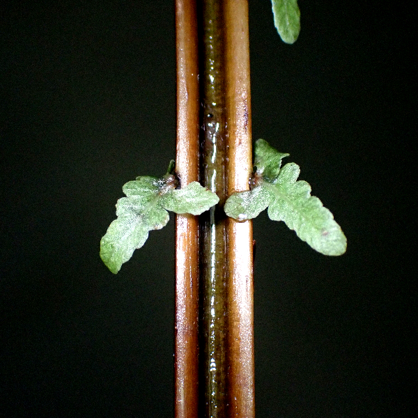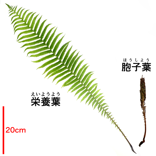 人里近くの湿った場所に多いシダ。 光合成をする葉は下ほど縮まる形をしていて、 葉裏に胞子のうをつけません。 胞子を飛ばす葉は小さく、 夏の終わりに出てきます。 放射状に葉をたくさん出す姿は草っぽいソテツに見えます。