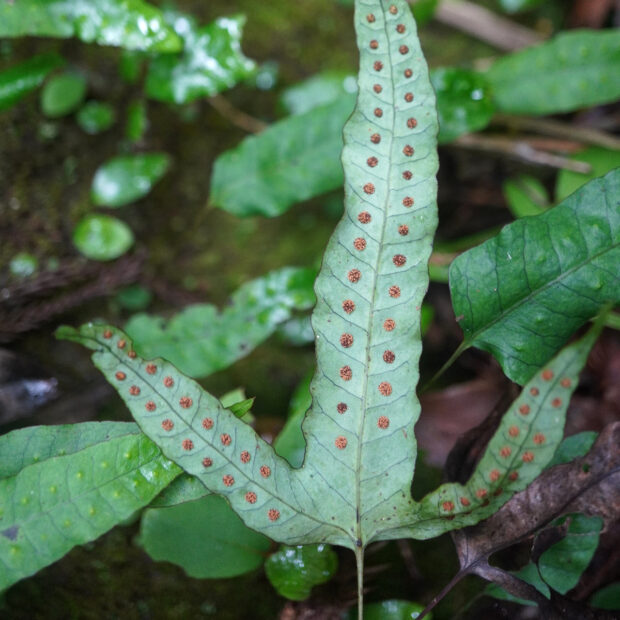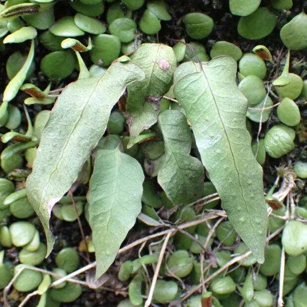 斜面によく生えている小さめのシダです。 大きな葉では名前の通り3つの切れ込みがありますが、 小さめの葉では切れ込みが2つ、 無いなど変化が大きいです。 特に小さい葉は丸みがあってかわいらしいです。