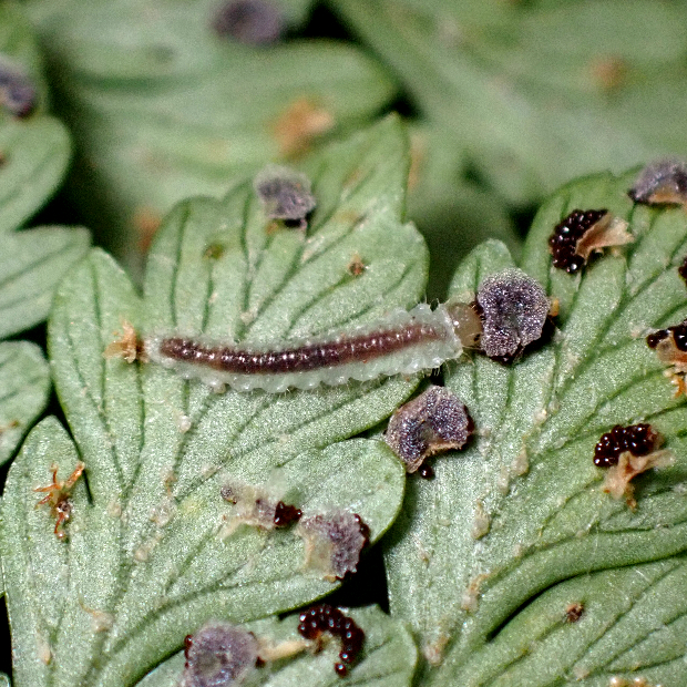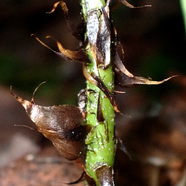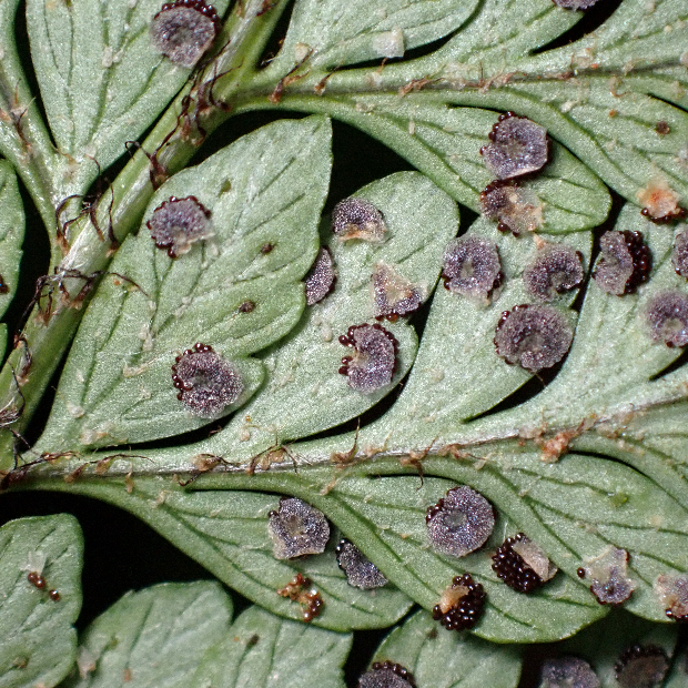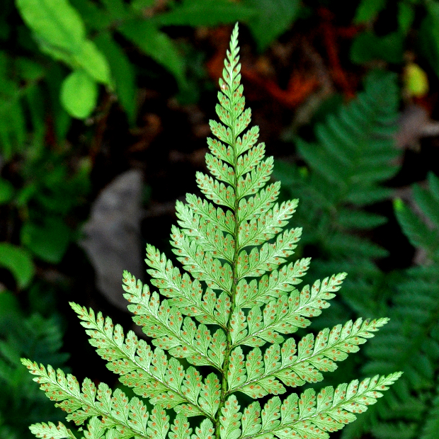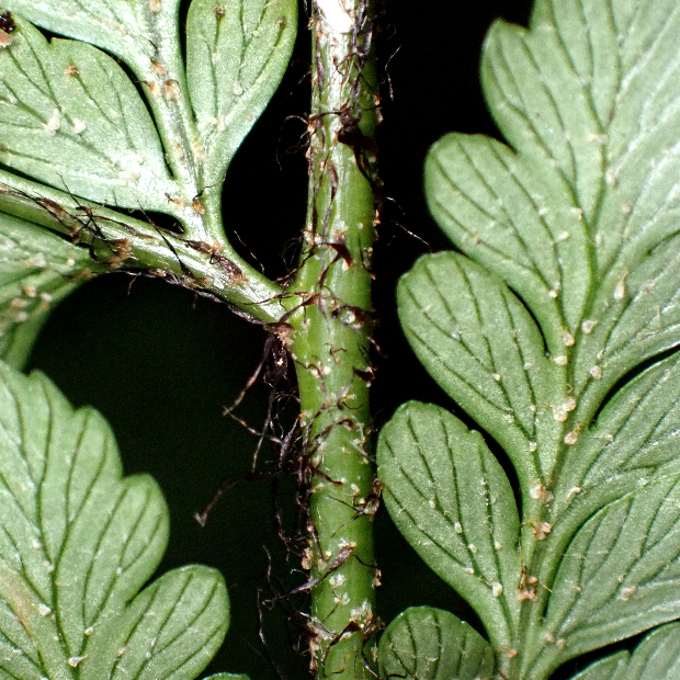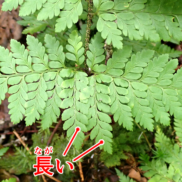 高山に多いシダで、 北日本では低地でも見られます。 葉色はふつう黒っぽさがあり、 葉柄には黒っぽい、 葉柄基部には茶色っぽい鱗片がたくさんつきます。 名前は同じシダのシノブに似たカグマ(シダの古い呼び名)の意味があります。