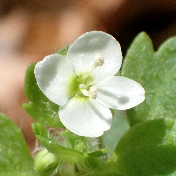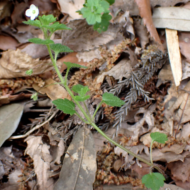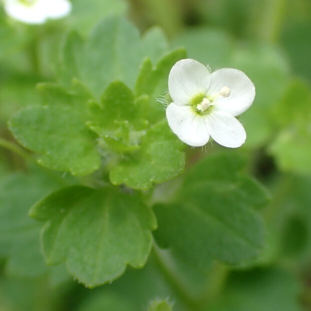 ヨーロッパからやってきた外来種です。 オオイヌノフグリに似ていますが、 花は白く、 茎にはまばらに長い毛が生えています。 名前は同じく白花を咲かせるハマウツボ科のコゴメグサに似たイヌノフグリという意味です。