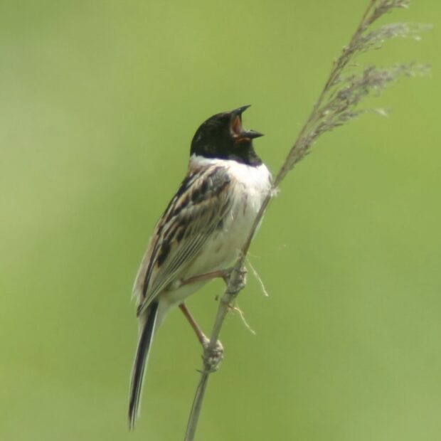 オスの頭は黒色で、 繁殖期に、 他よりも高い草や枝の上で囀ります。