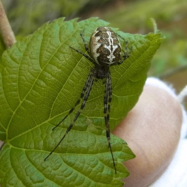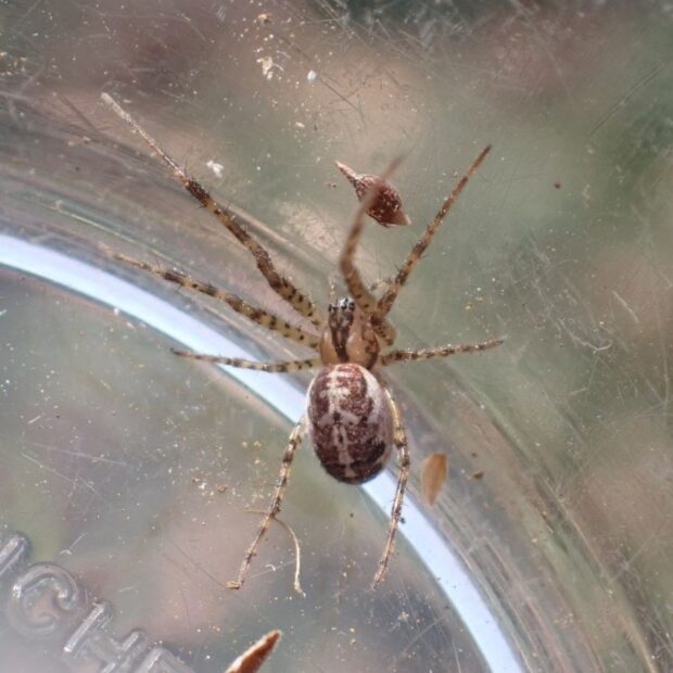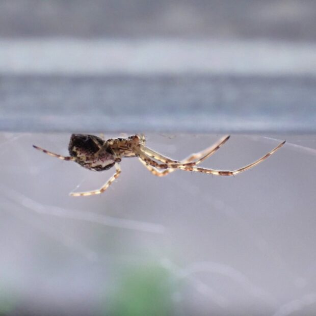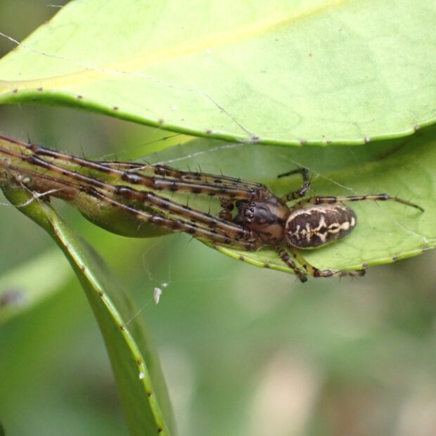 水平円網を張るアシナガグモの仲間。 平地~山地の公園の池や渓流沿いなど、 幅広い環境の水辺近くで見られます。 「メガネ」は頭胸部のメガネのような模様、 「ドヨウ」は夏の土用の頃に多く見られることから名づけられました。