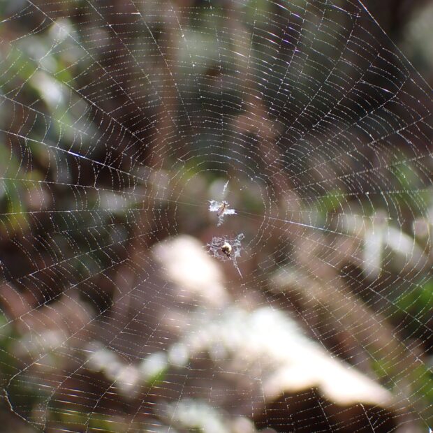 コガネグモの仲間。 都市部の公園で普通に見られる銀色のクモ。 うす暗い所に垂直のまるい網をはり、 頭を上にしてとまります。 網にかくれ帯をつけたり、 ゴミを並べることがあります。