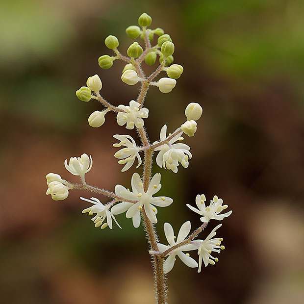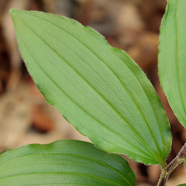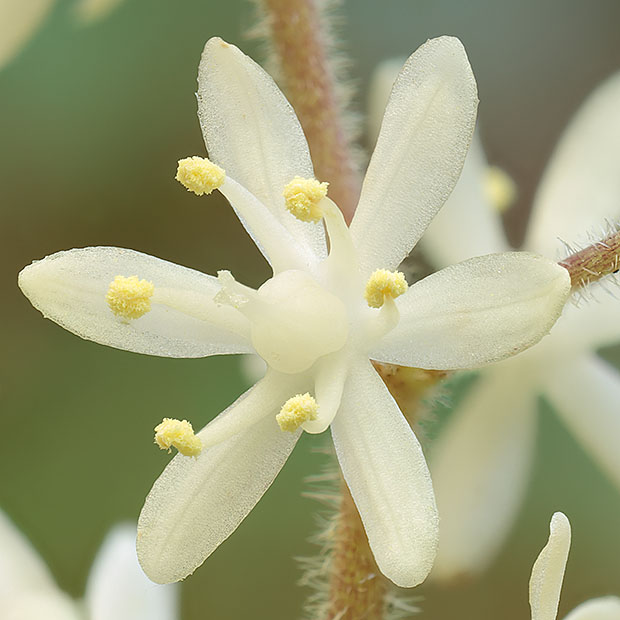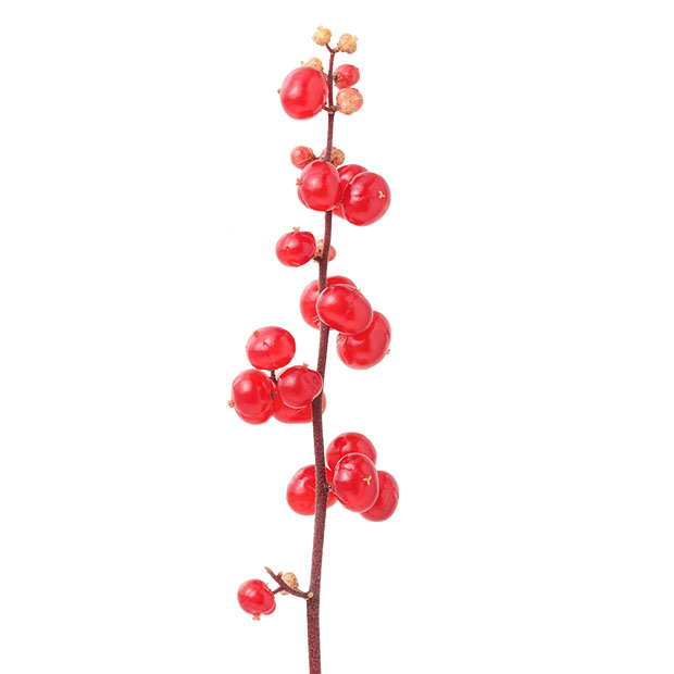 茎の頂部に雪のように白い花を咲かせます。 葉は幅の広い笹の葉のような形をしています。 赤い実が実ります。