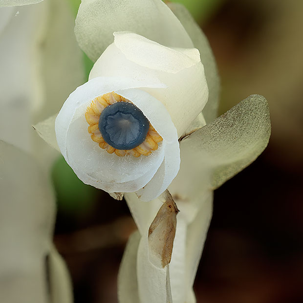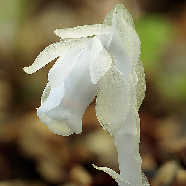 葉緑体をもたず、 全体が白色です。 光合成で栄養を作らない代わりに、 ベニタケなどのきのこから栄養を得ています。