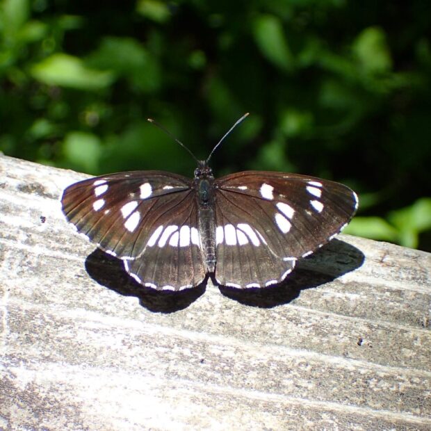 ミスジチョウの仲間。 他のミスジチョウ類は、 後ばねの白帯が2列ありますが、 本種は1列です。 日中、 滑空をまじえて飛び、 花を訪れます。 地面で給水したり、 人の汗にもやって来ます。