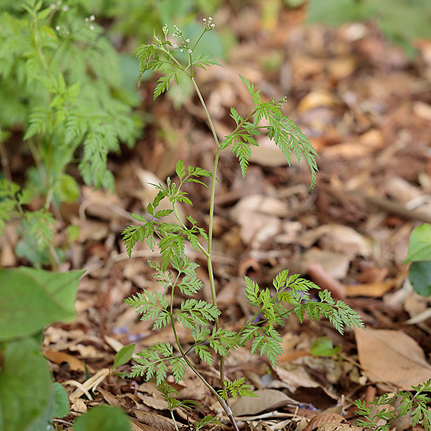 実はひっつき虫になります。 やぶを歩くと、 オヤブジラミの実が服について、 シラミがたかったようになります。 ヤブジラミににています。 オヤブジラミはヤブジラミより花の根もとの柄が長く、 となりの花と離れて咲き、 花びらが小さいので地味な印象です。 花は1カ月ほどはやく咲きます。
