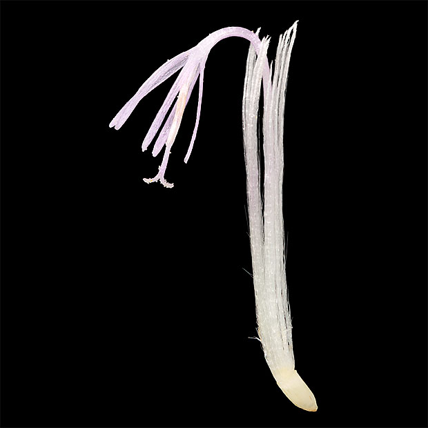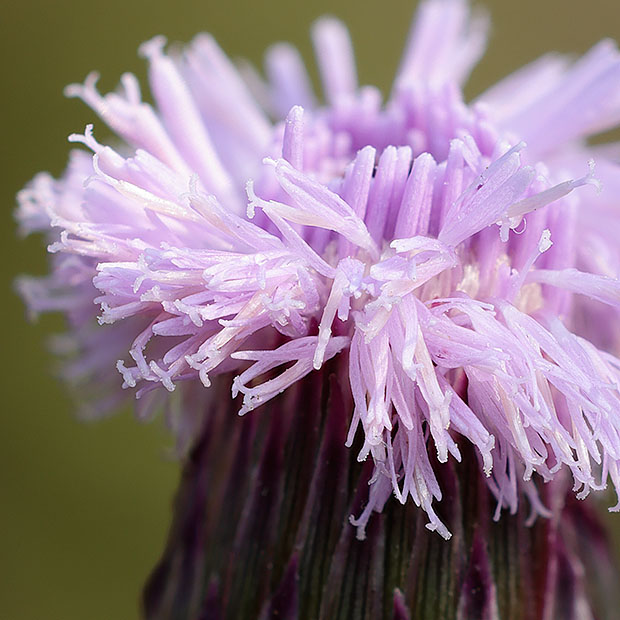 アザミのように見えるけど、 とげをもちません。 まるできつねにばかされた気分です。 キツネアザミ属に所属します。 ヒレアザミ属の実は15本の筋があるが、 ノアザミなどのアザミ属は実に筋がありません。