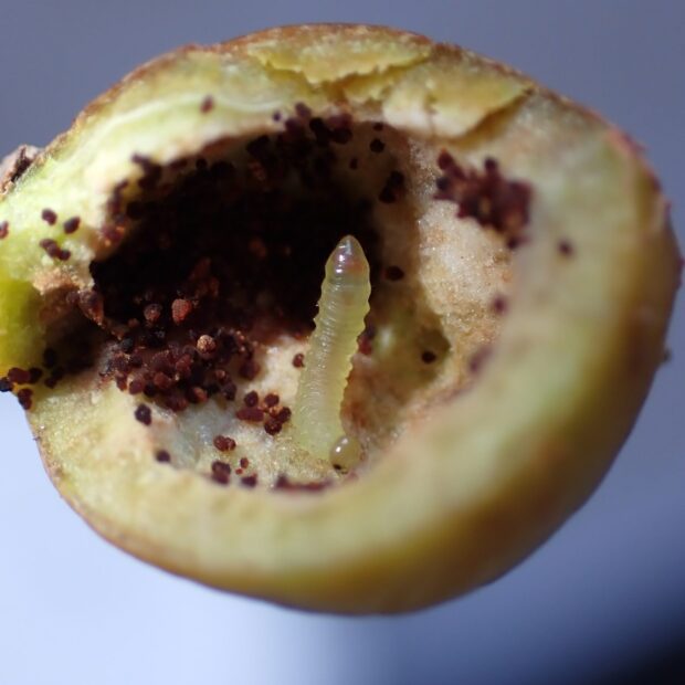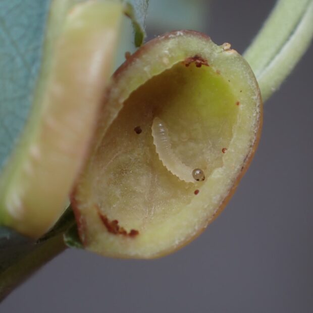 • 虫こぶの中は広く、 幼虫が1匹いる。