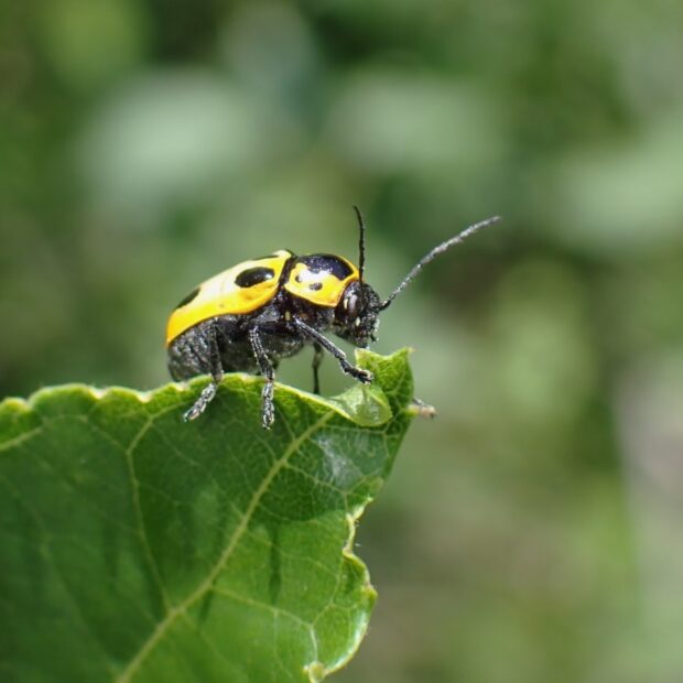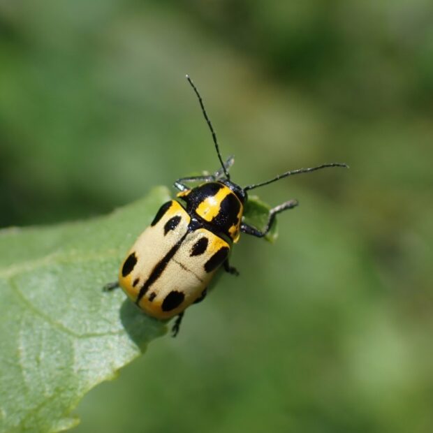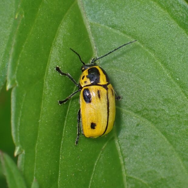 黄色い前ばねに黒い紋が8個あるツツハムシの仲間。 紋の数や形は個体差があり、 紋が8個ないのもいます。 卵はフンでつつまれ、 幼虫はフンのケースに入っています。