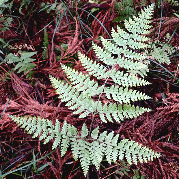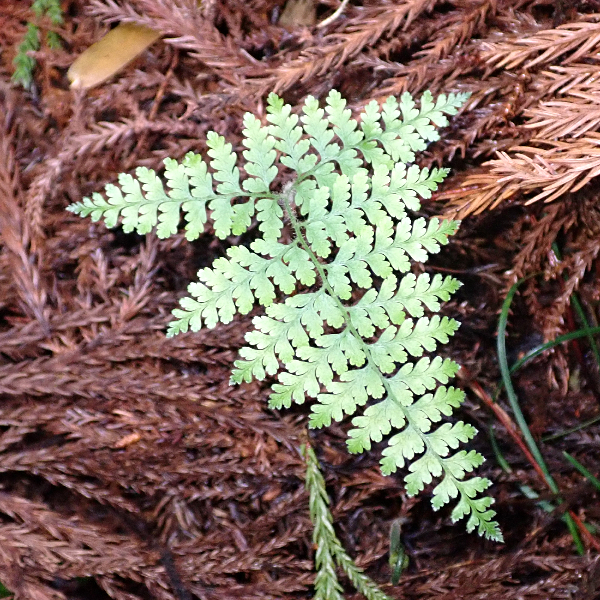 暖かい地域に多いシダです。 葉は長めの三角形で細かく切れ込み、 葉柄などに長い毛が多いのが特徴です。 名前は小さめのイシカグマという意味ですが、 大きさよりも葉形や切れ込み方などの点でイシカグマとはあまり似ていません。