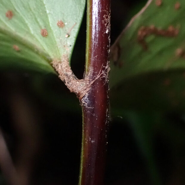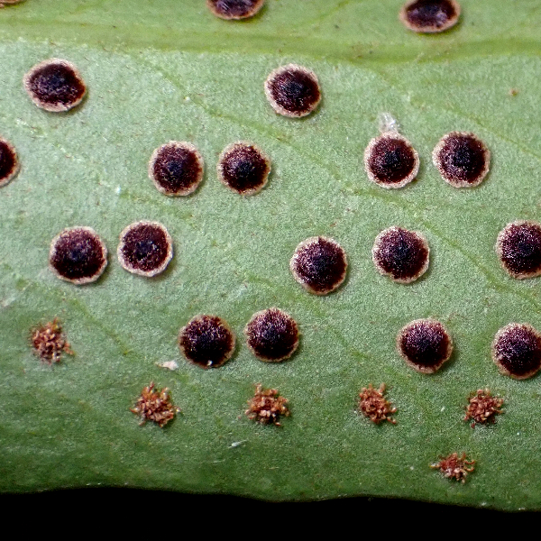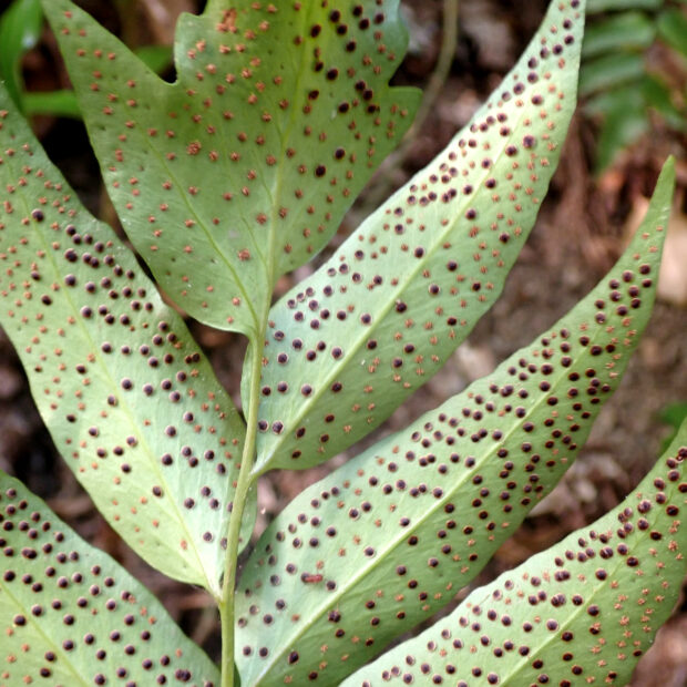 濃緑色でテカテカの海岸近くに多いシダ。 内陸寄りに多いナガバヤブソテツよりも葉は厚みがあり、 羽片は基部で一番幅広く、 先に行くにしたがって細くなっていきます。 庭園によく植えられる、 人との関わりが深いシダの1つです。