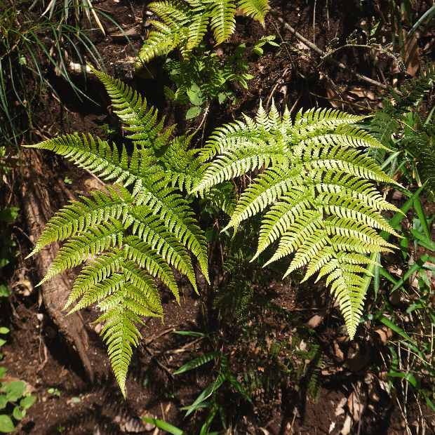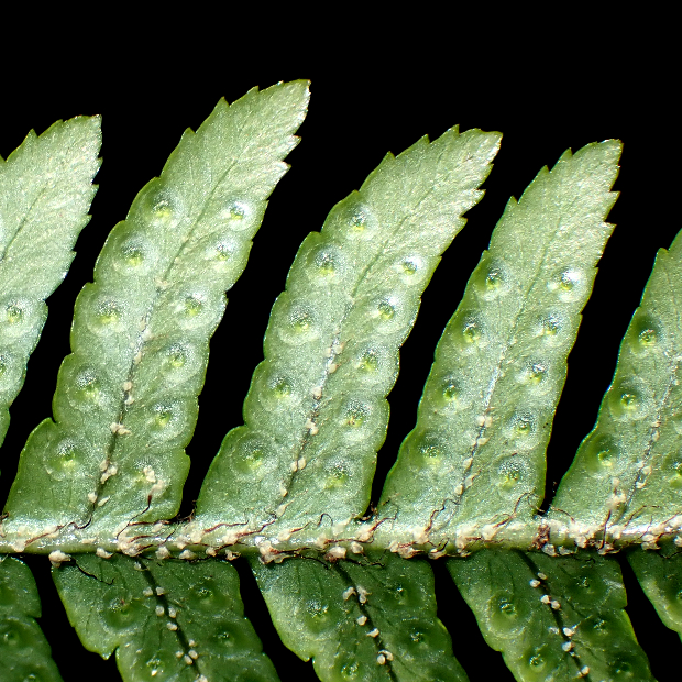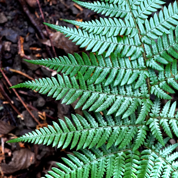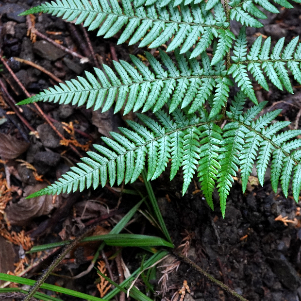 上のスライドは葉のフチが内側に巻くアツバオオイタチシダといわれるタイプです。 そのほかにも、 葉が黄緑色でツヤがないものはツヤナシオオイタチシダ、 葉が平面的でツヤのあるものはアオニオオイタチシダと呼ばれています。 以前までこの1つに含まれていたベニオオイタチシダは、 2018年に新種として独立しました。