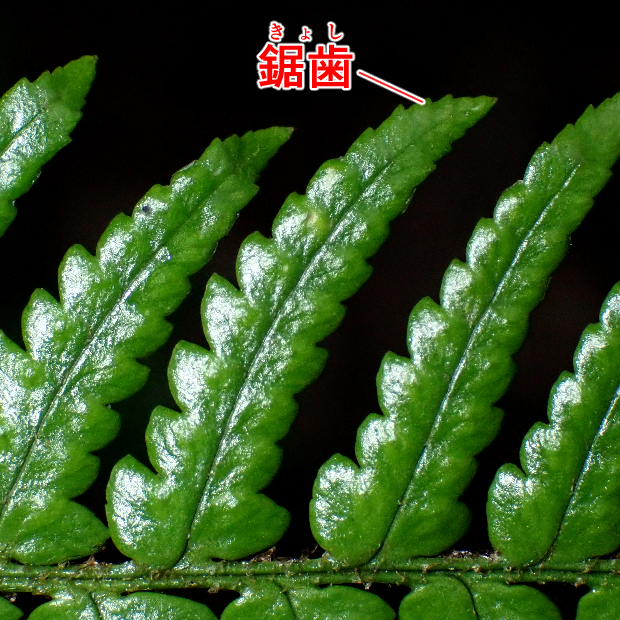 都市公園でもよく見られる身近なシダ。 イタチシダ類は葉の中央一番下の切れ込み2本が八の字に伸びます。 その中でも本種は、 葉が厚くて革っぽく、 葉幅が広めで、 切れ込み先のフチにはっきりとしたギザギザ(鋸歯)があります。 葉柄にたくさんつく鱗片がイタチに例えられました。