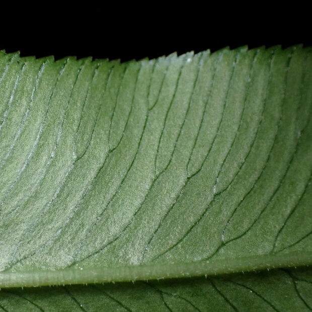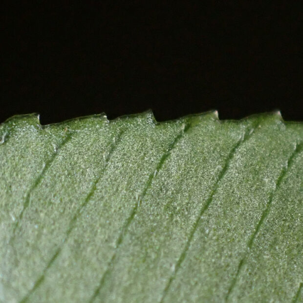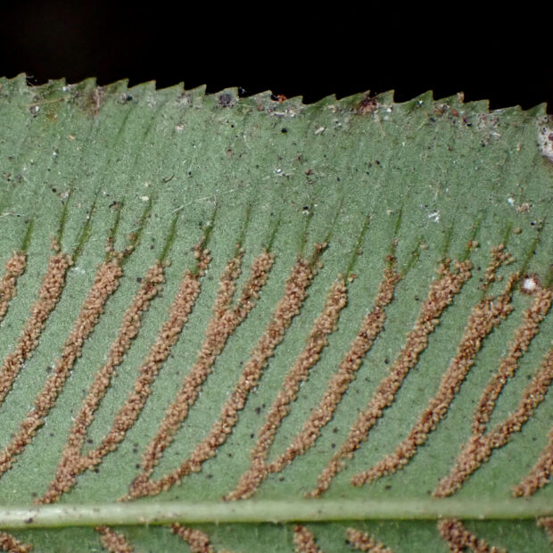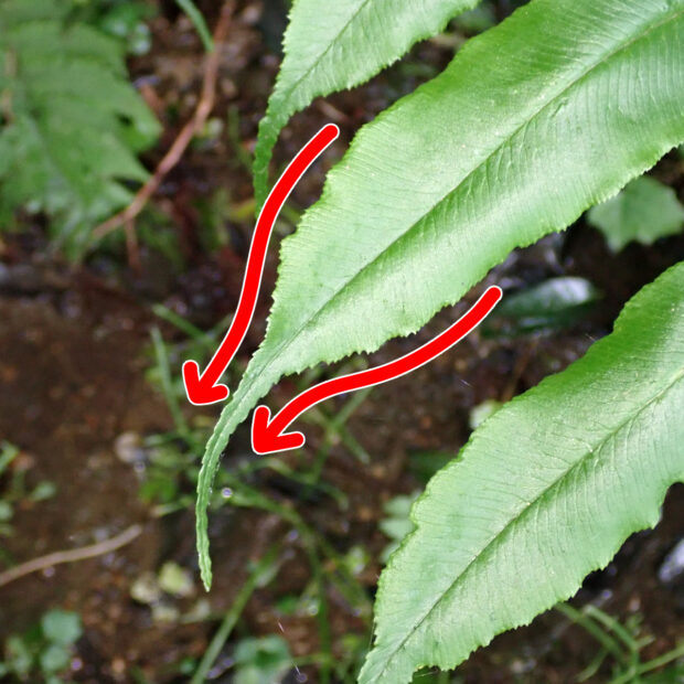 ●イワガネソウは①羽片先がなだらかに細くなり、 ②葉脈は網目を作り、 ③葉脈の先はふつう鋸歯に入りません。 このほかにも、 イワガネゼンマイとくらべると葉色は濃くて、 羽片の数は少なめで、 胞子のう群はフチ近くまで長くつけることが多いです。