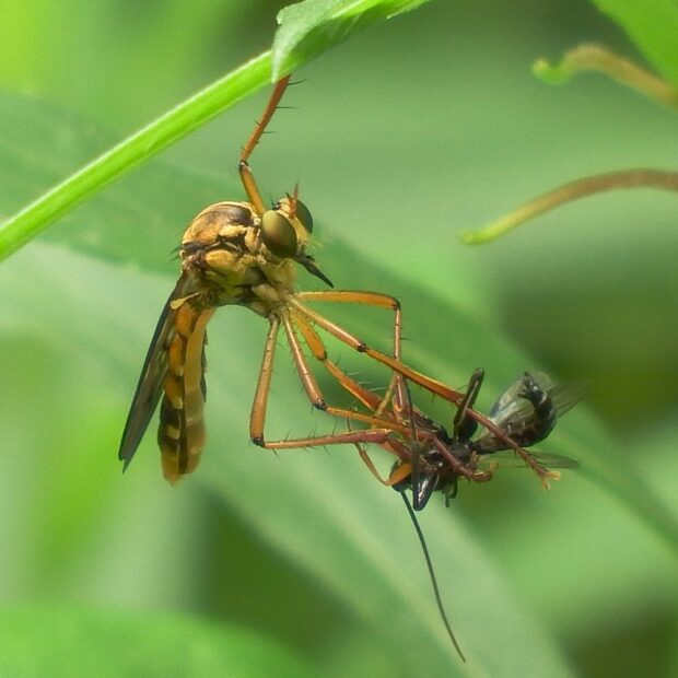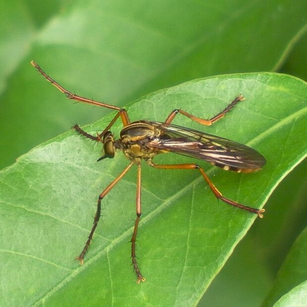 片方の前あしをあげて葉にとまり、 獲物を待ち伏せするムシヒキアブ。 ハチ類を好んで捕らえ、 体液を吸います。 片方の前あしだけでぶら下がり、 獲物を捕食することがあります。 林縁などで見られます。