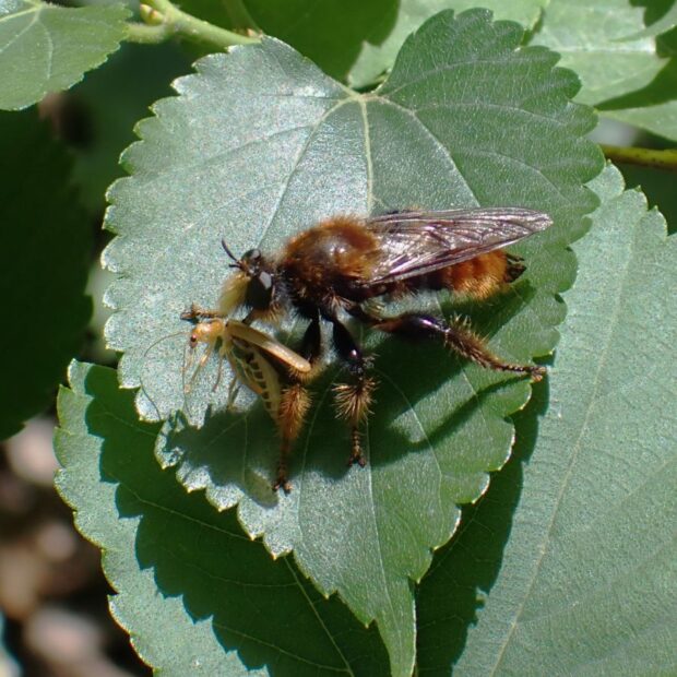 初夏に多い黒色で大きなムシヒキアブ。 体はオレンジ色と黒色の毛、 顔には淡い黄色の毛がはえています。 林縁など日当たりのいい場所で待ち伏せをし、 虫が飛んでくると捕えて体液を吸います。 人は刺しません。