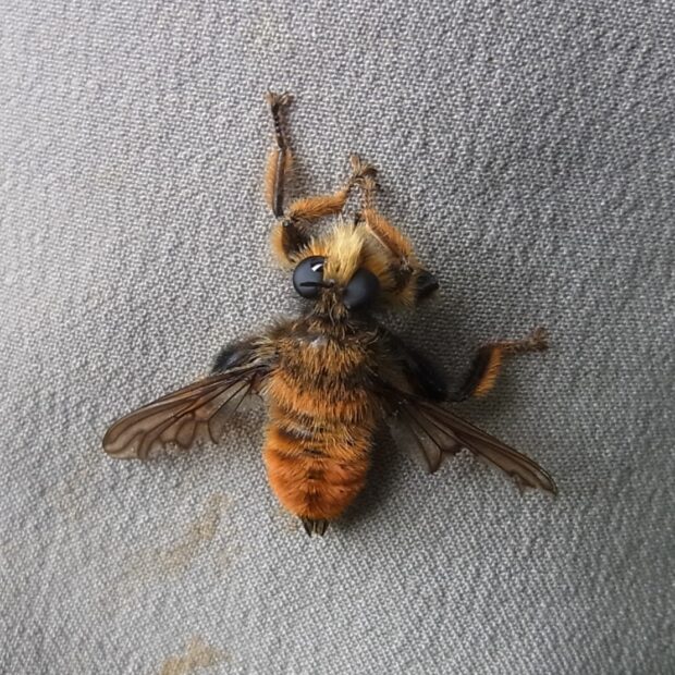 黒色とオレンジ色の毛むくじゃらで大きなムシヒキアブ。 腹部(第2節以降)にはオレンジ色の毛、 顔には淡い黄色の毛がはえています。 見晴らしのいい所で待ち伏せをして獲物を捕え、 体液を吸います。 人は刺しません。